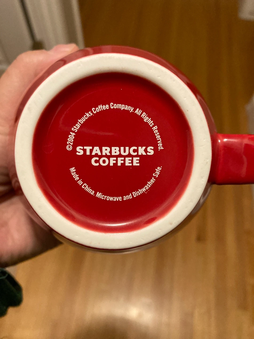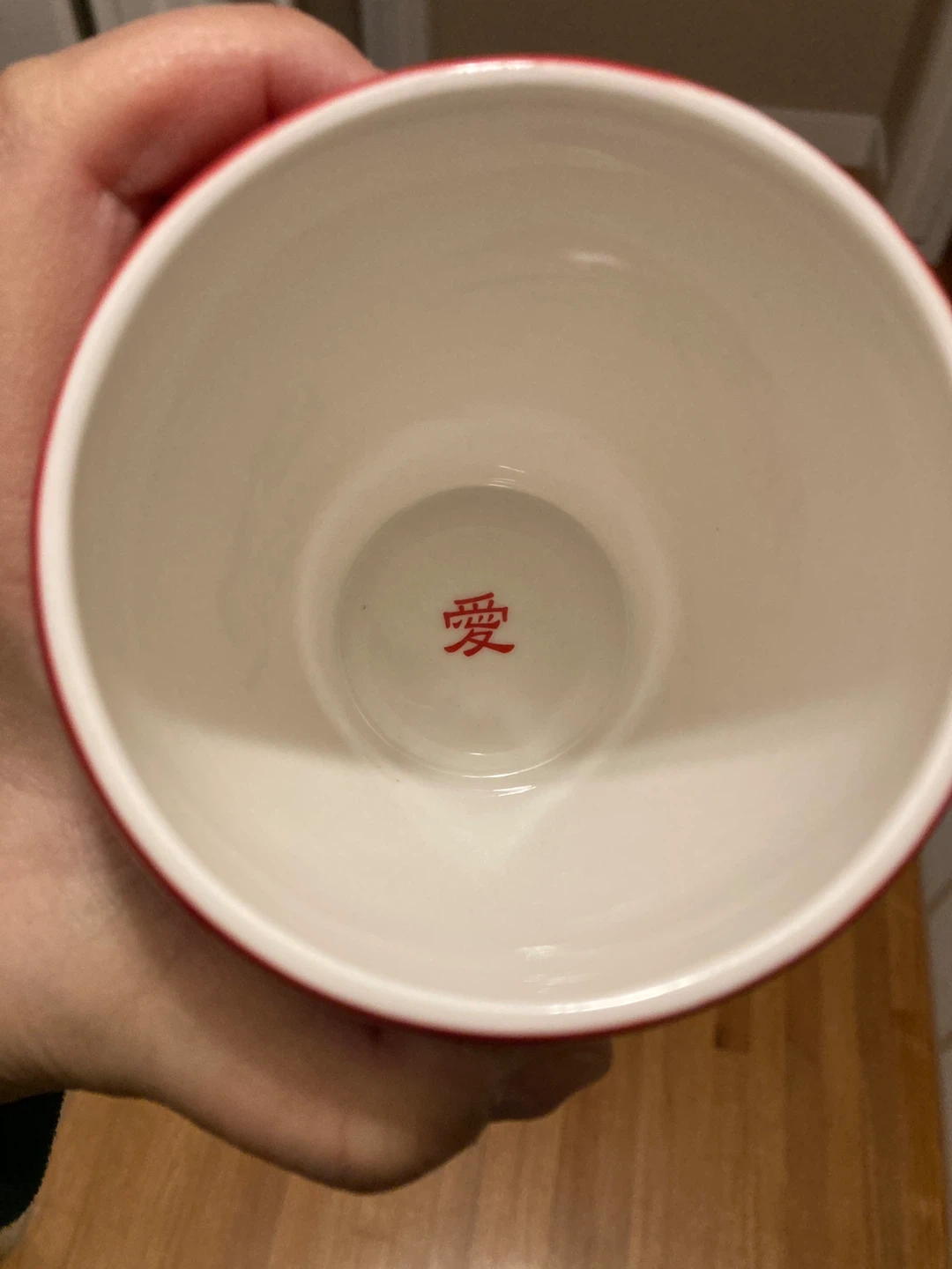 A red Starbucks coffee mug with "Love" printed on the outside. It's microwave and dishwasher safe. Made in China. The inside features a red Chinese character for love.