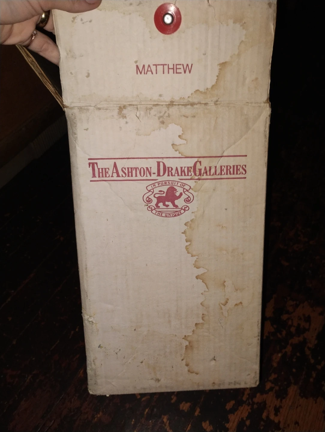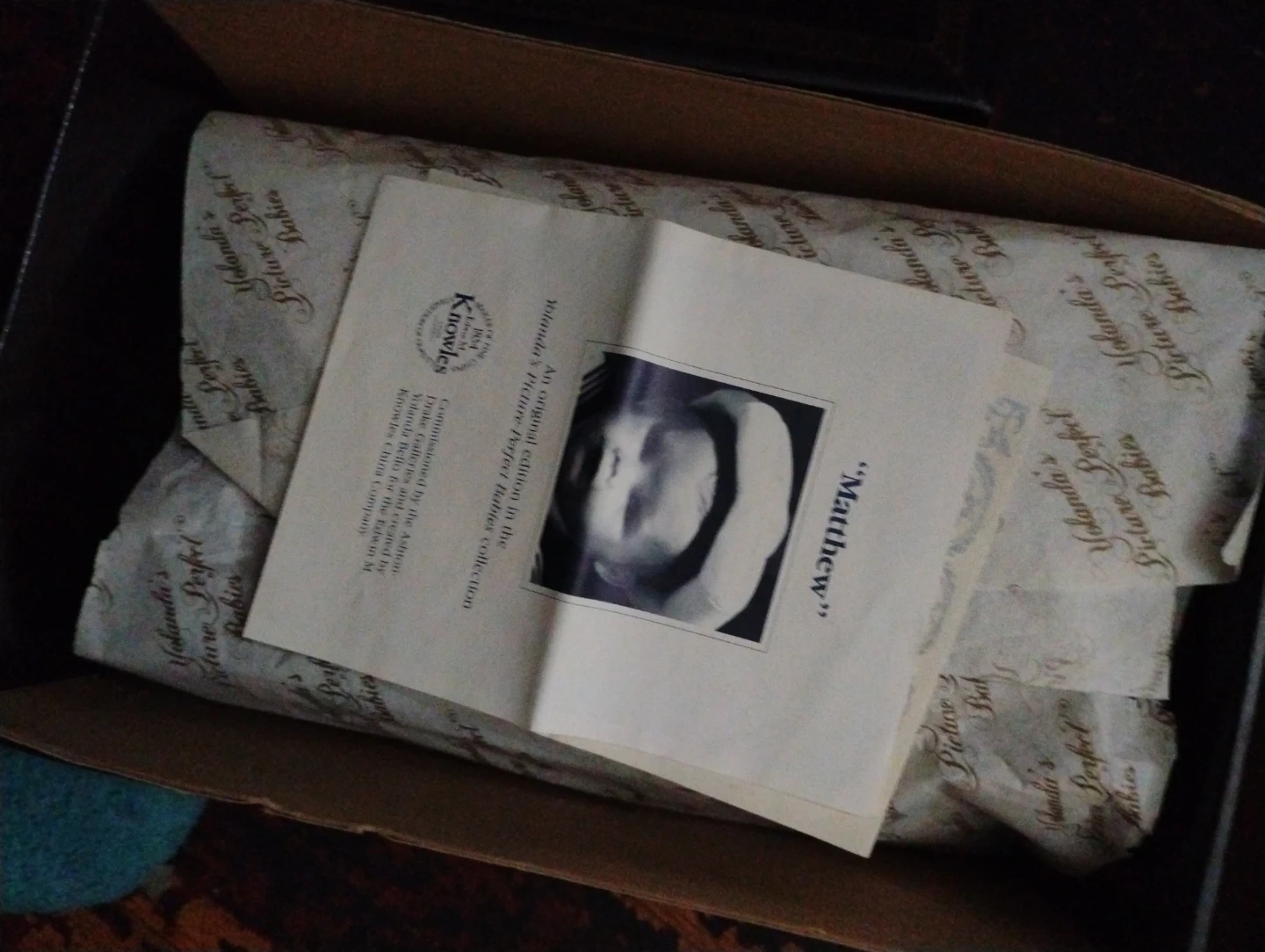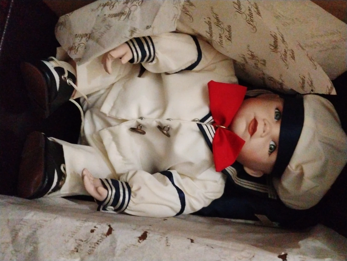 This is Yolanda's Picture Perfect Babies "Matthew" doll. It's dressed in a sailor-style outfit. The doll comes in its original box with packaging paper.