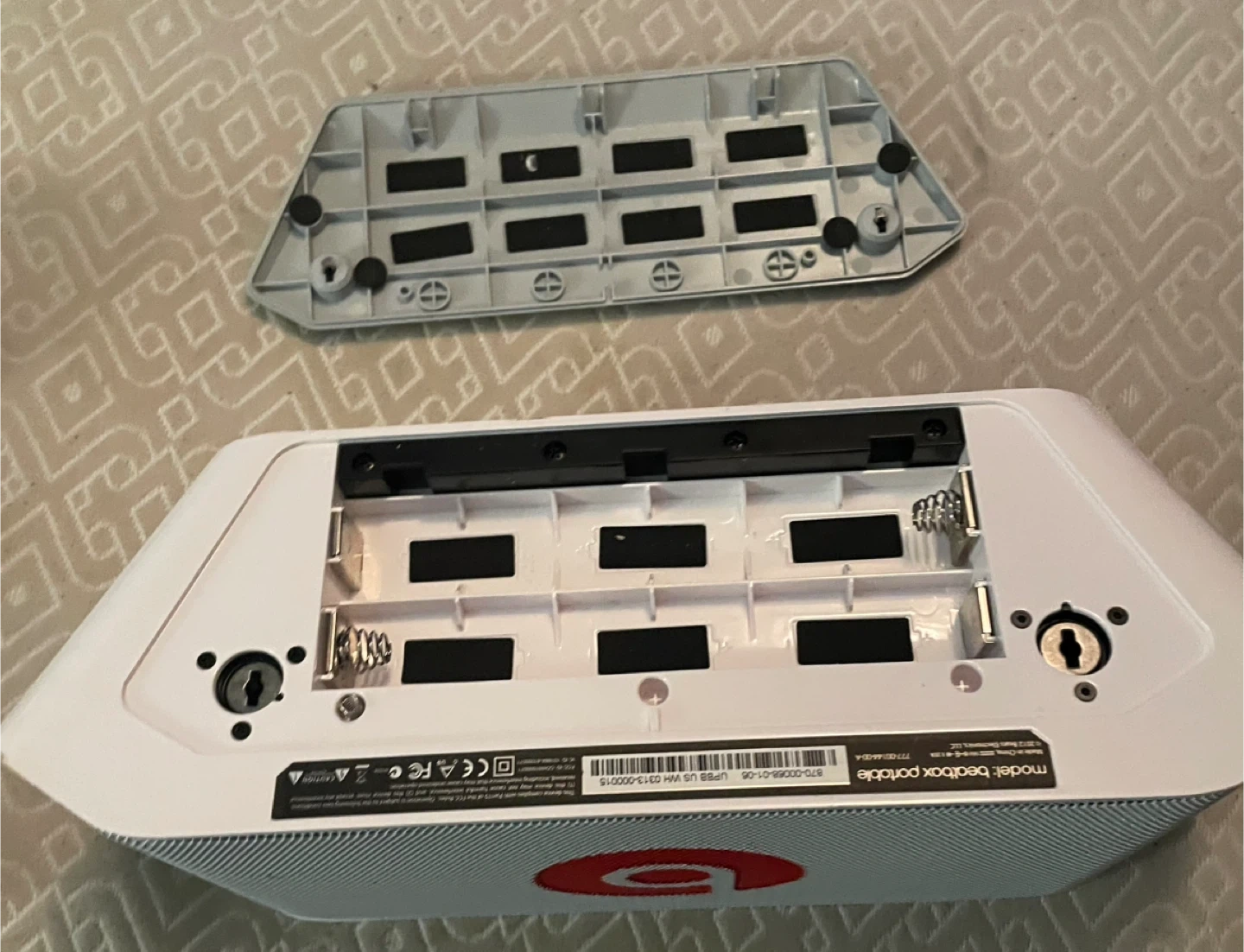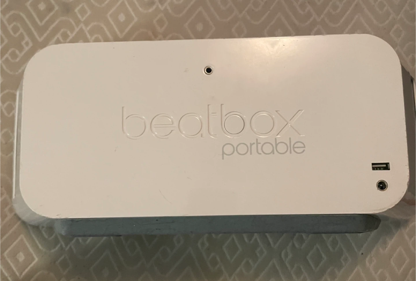 This is a white Beats by Dr. Dre Beatbox portable speaker. It has a Bluetooth, USB port and an aux input. This speaker is battery-powered and includes a battery compartment on the bottom.