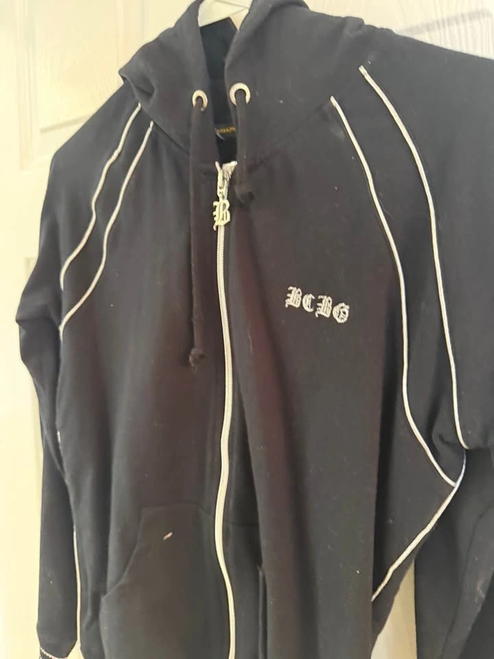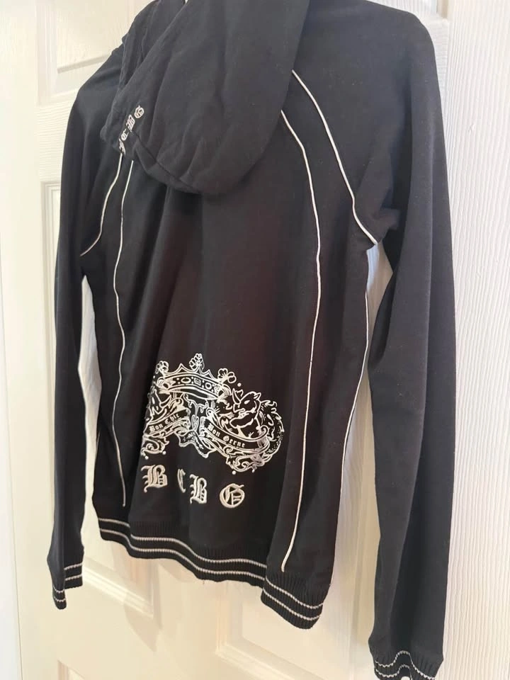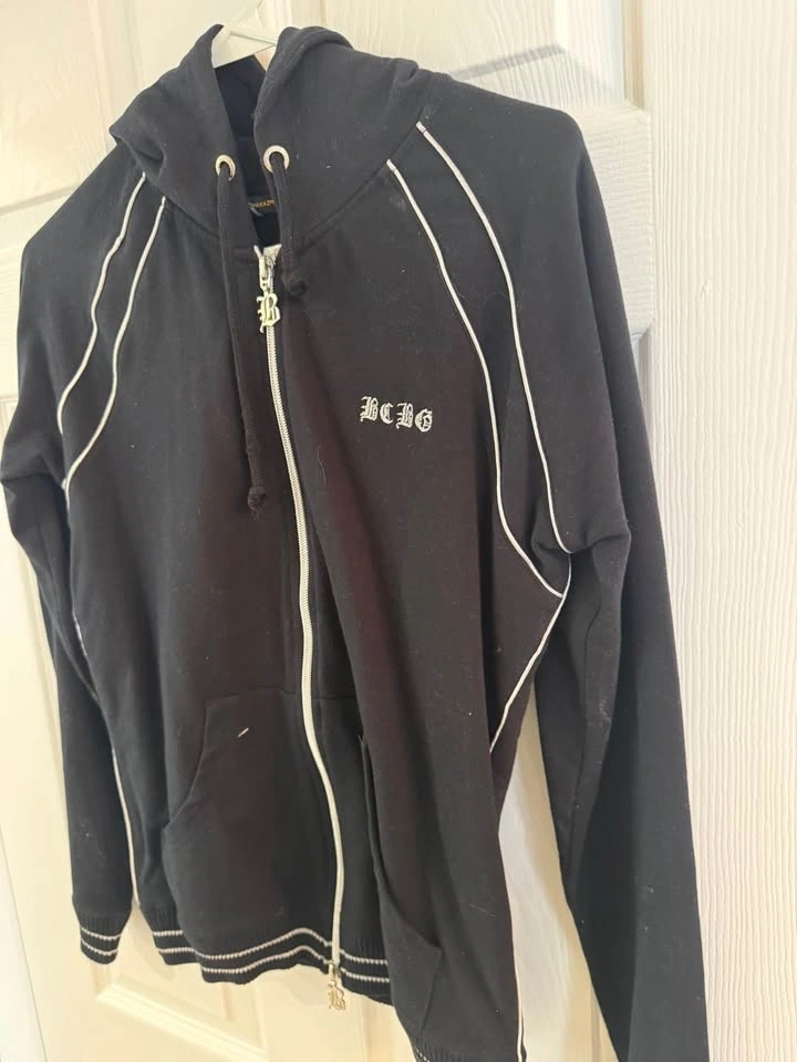 Comfy BCBG black zip up hoodie with white piping details and embroidered BCBG logo. Features a silver zipper with a B charm and front pockets.