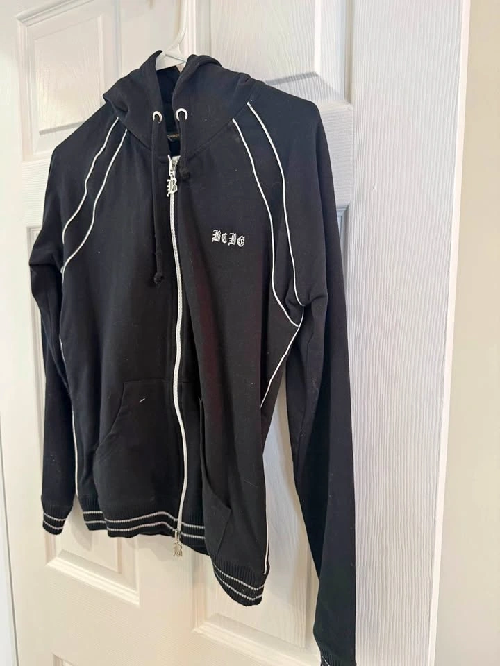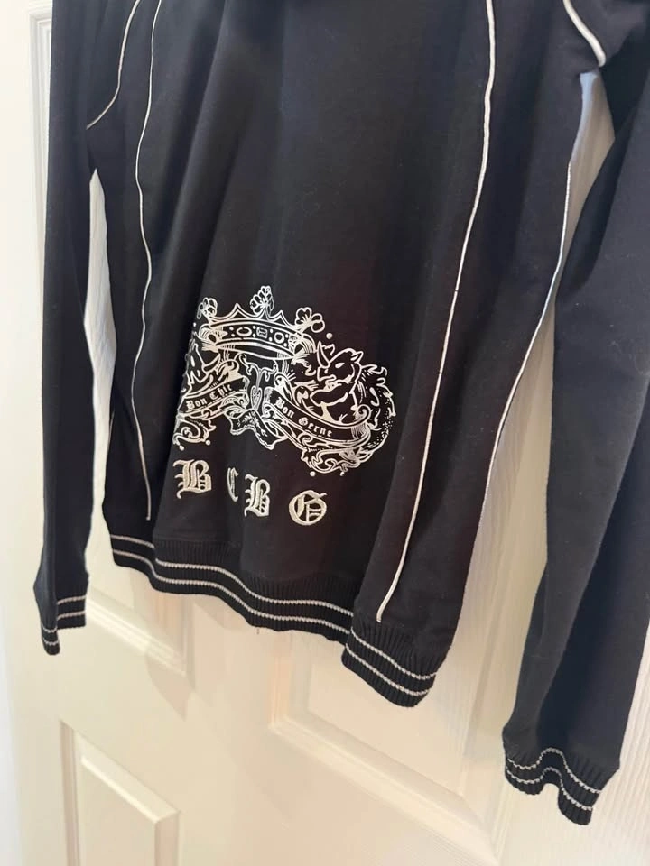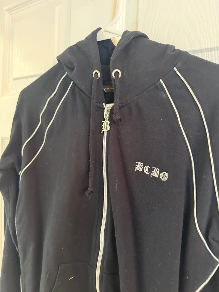 Comfy BCBG black zip up hoodie with white piping details and embroidered BCBG logo. Features a silver zipper with a B charm and front pockets.