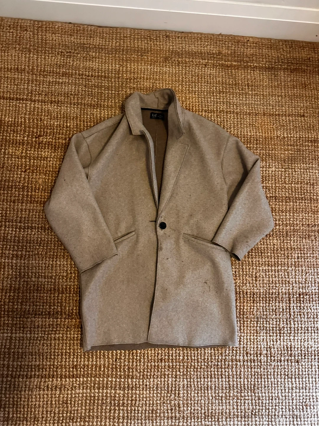 Beige wool blend blazer from TRF. It's a size medium and features a single button closure and two front pockets. Some minor marks on the fabric.