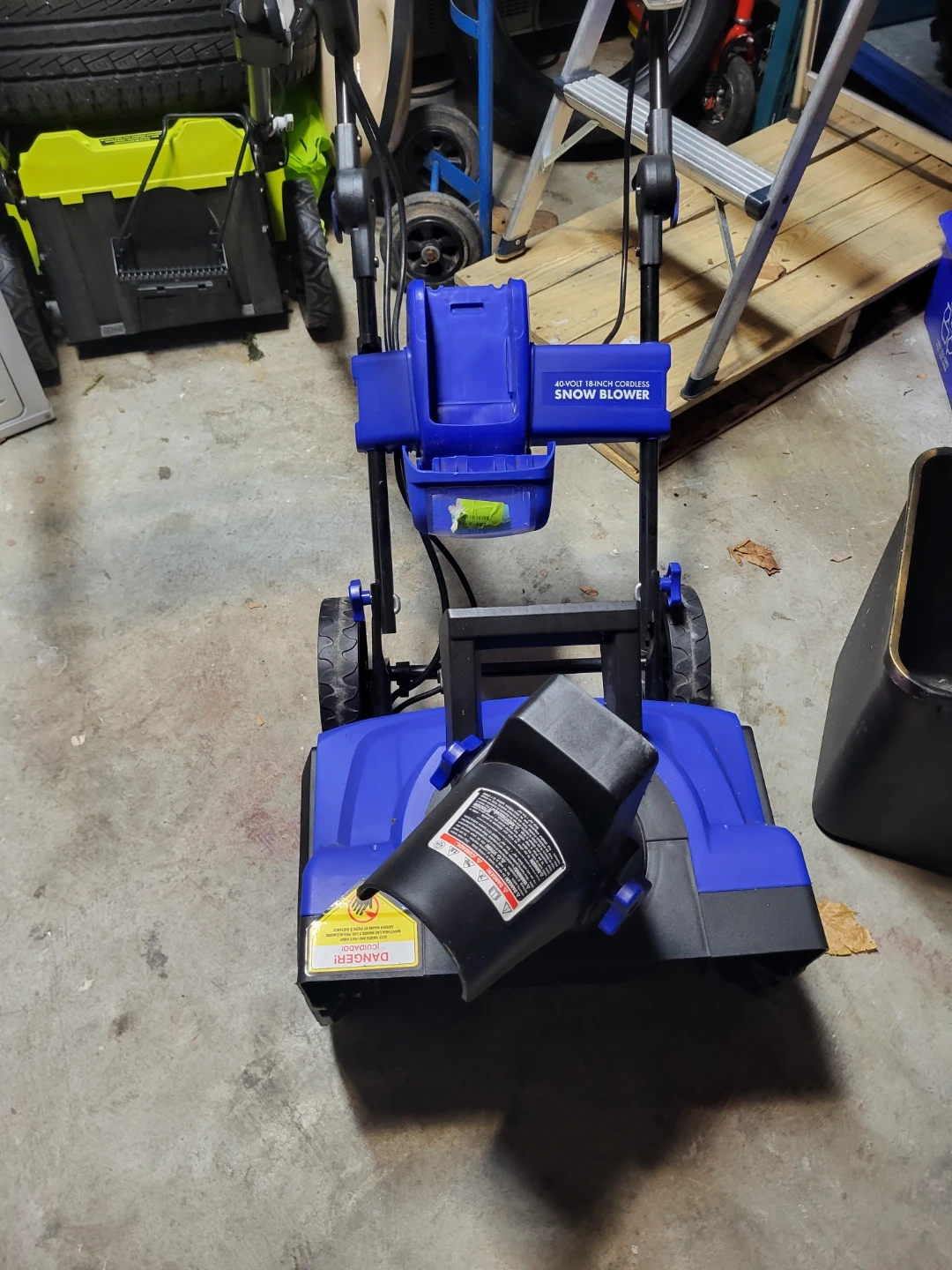 This 40-volt cordless snow blower has an 18-inch clearing width. It's blue and black. This is a great tool for clearing light snow from driveways and walkways. It's battery-powered and easy to manoeuvre!