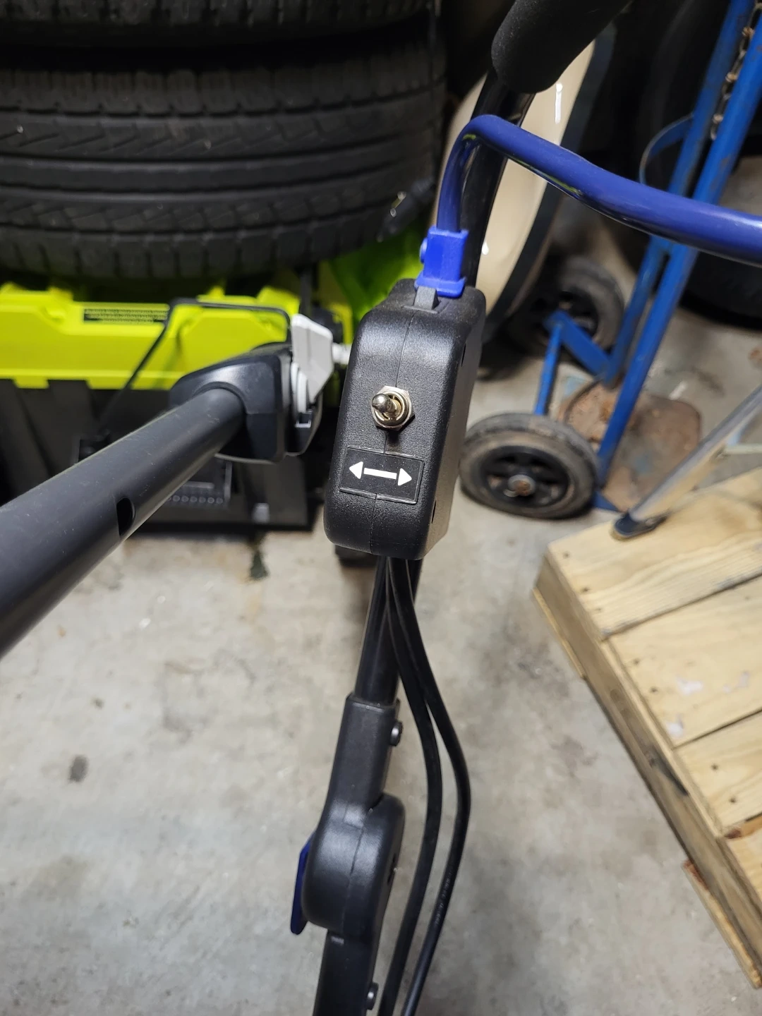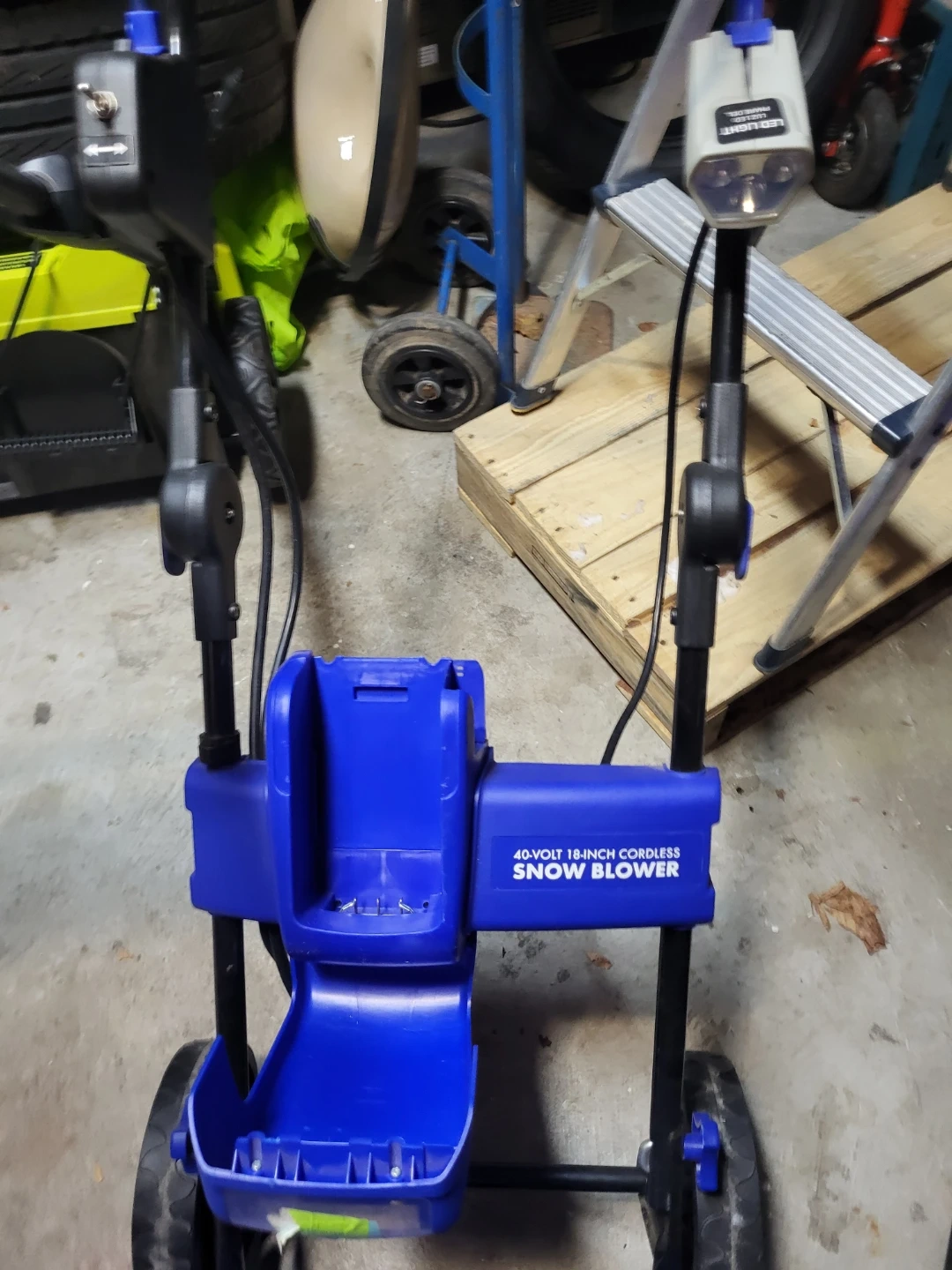 This 40-volt cordless snow blower has an 18-inch clearing width. It's blue and black. This is a great tool for clearing light snow from driveways and walkways. It's battery-powered and easy to manoeuvre!