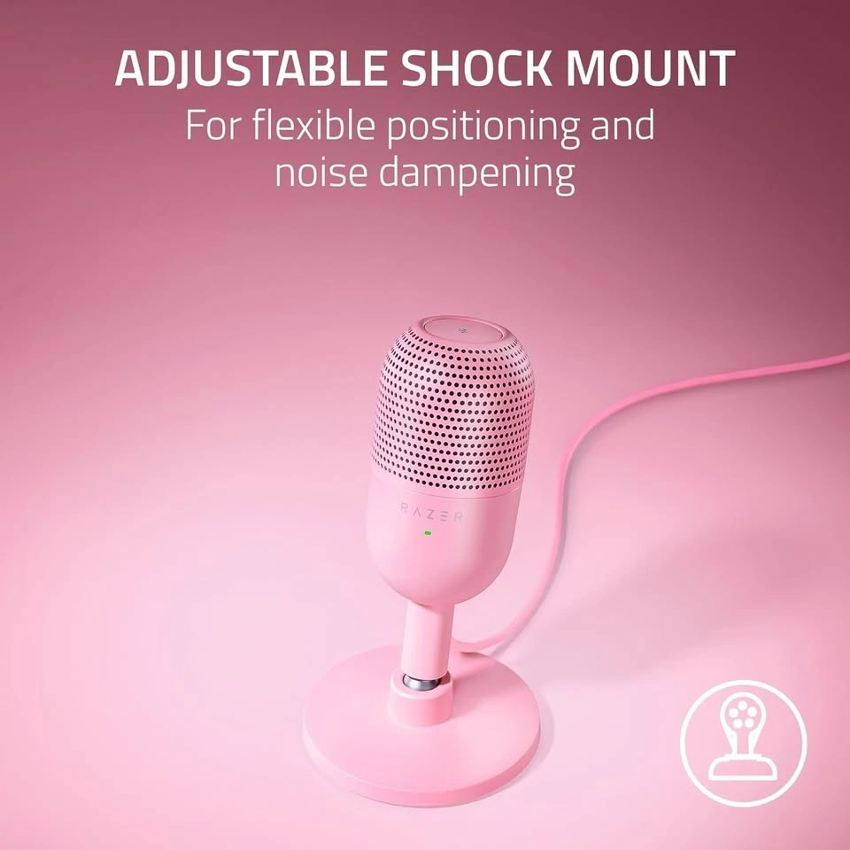 NEW in opened package. Model# RZ[hidden information]-R3U1. CONDENSER MIC — Fitted with a custom condenser capsule, the mic's impressive sensitivity can capture more detail, especially at higher frequencies, ensuring it broadcasts voice with stellar clarity and quality. SUPERCARDIOID PICKUP PATTERN — A tighter pickup pattern allows the mic to focus on your voice while suppressing room noise, so never worry about sounds like typing or mouse clicks getting in the way. TAP-TO-MUTE SENSOR WITH LED INDICATOR — Whether gaming, chatting, or streaming, instantly prevent audio mishaps by simply tapping the top of the mic, and tell at a glance if the mic is active or not with an LED status indicator. BUILT-IN SHOCK ABSORBER — Find the sweet spot with a tiltable mic stand that also features a built-in shock absorber to dampen noise caused by accidental knocks and bumps (can be detached for a boom arm setup). PLUG-AND-PLAY DESIGN — Be ready to game, stream, or chat in seconds by simply plugging the USB mic into a PC and it's good to go—no software or drivers required and it works with Discord, OBS Studio, and XSplit. ADVANCED CUSTOMIZATION VIA RAZER SYNAPSE — From studio-level sample rates to separate volume mixes for playback and the audience, create the perfect setting and manage it all from one powerful platform.