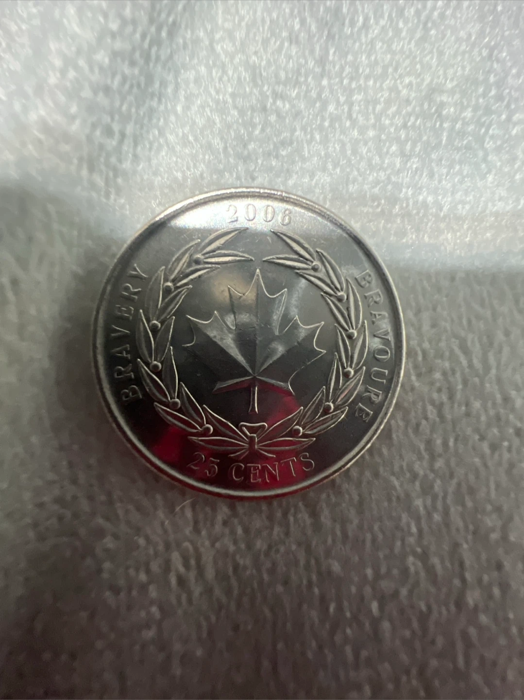 A Canadian 25 cents coin featuring Queen Elizabeth II on one side and a maple leaf with the text "Bravery" on the other. Minted in 2006.