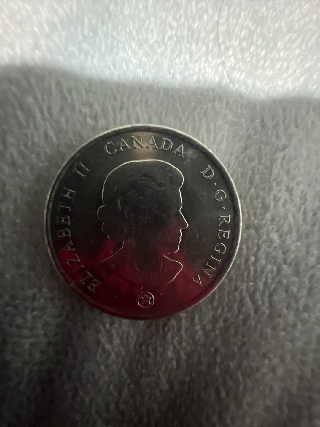 A Canadian 25 cents coin featuring Queen Elizabeth II on one side and a maple leaf with the text "Bravery" on the other. Minted in 2006.