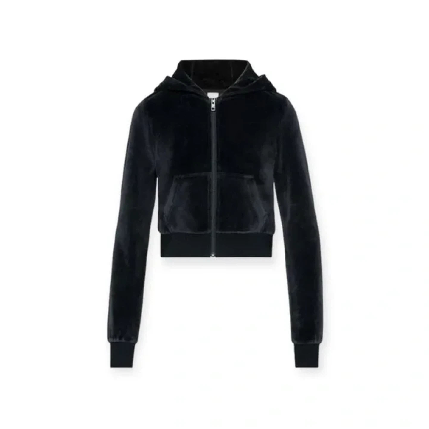 Stay cozy and stylish with this black velour hoodie. Perfect for casual outings or lounging at home.