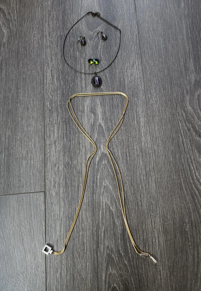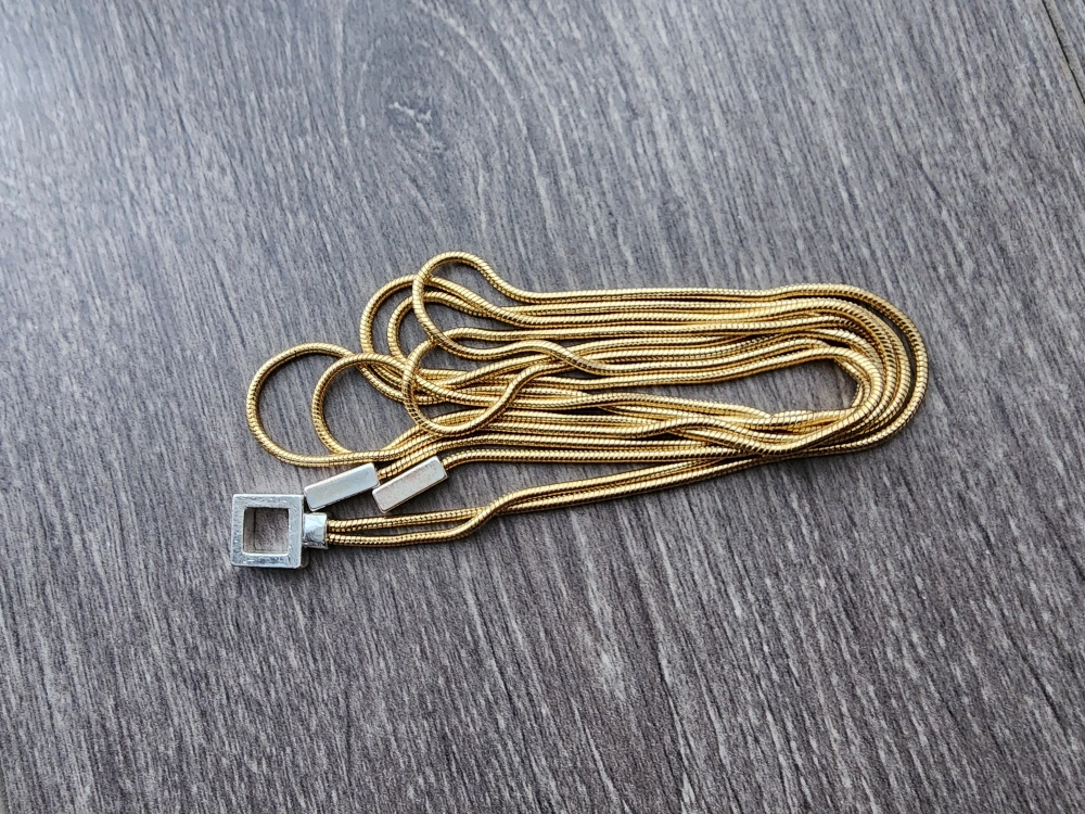 Long gold tone chain --- dont know if it is a necklace or a waist chain, maybe both.