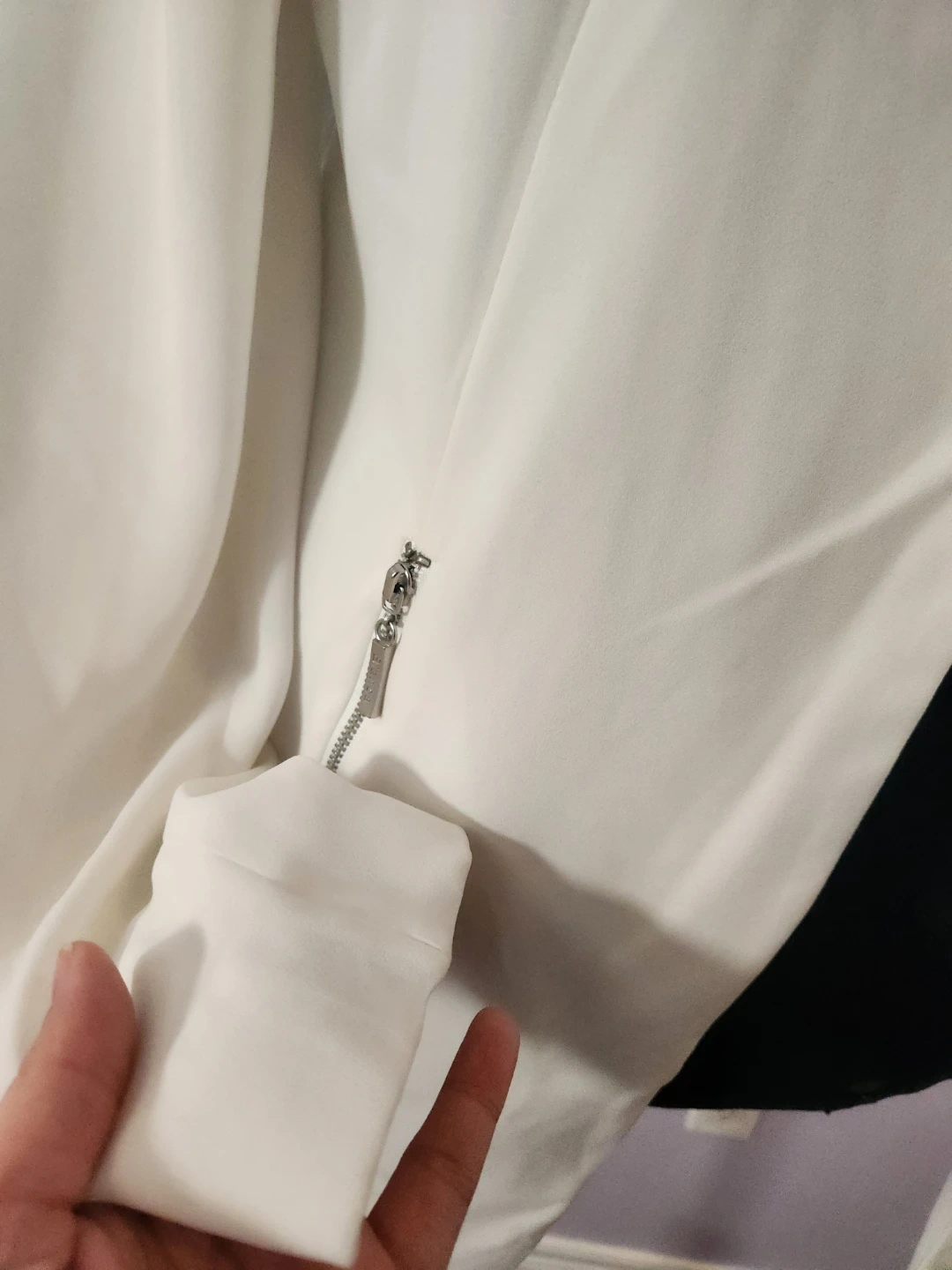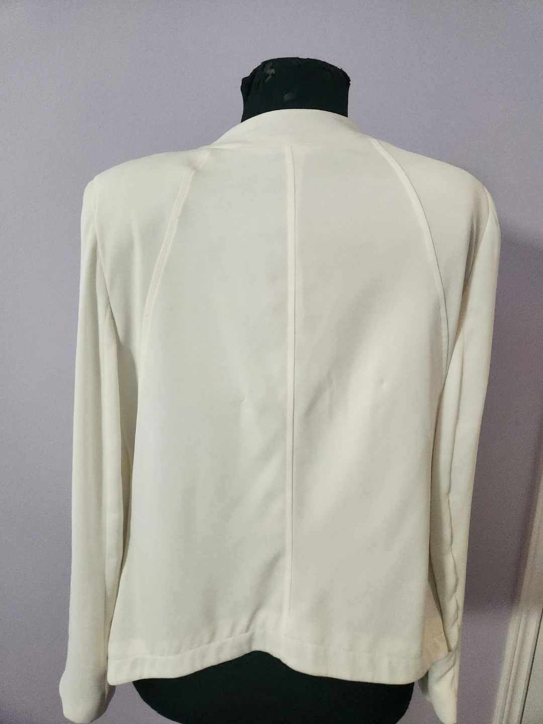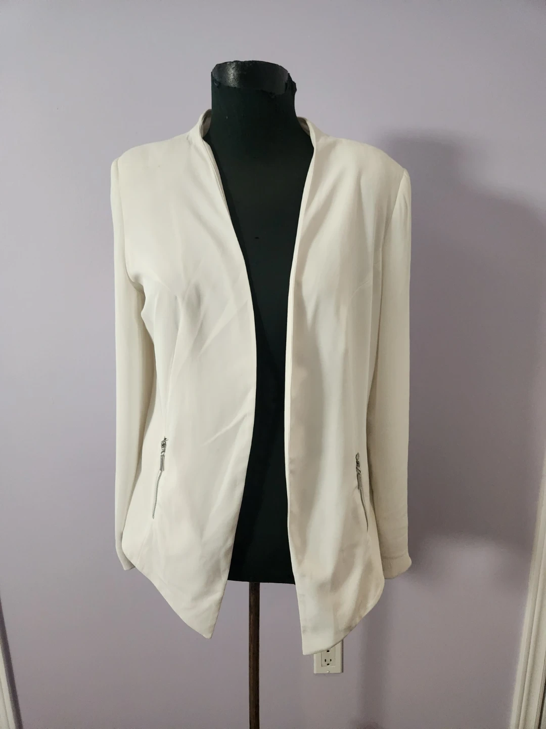 White Bianca Nygard blazer with zip pockets. Size 10. This blazer is perfect for layering over outfits for a polished look. Soft inner lining. Shoulder pads. Minor, small staining on top right shoulder. Worn twice.