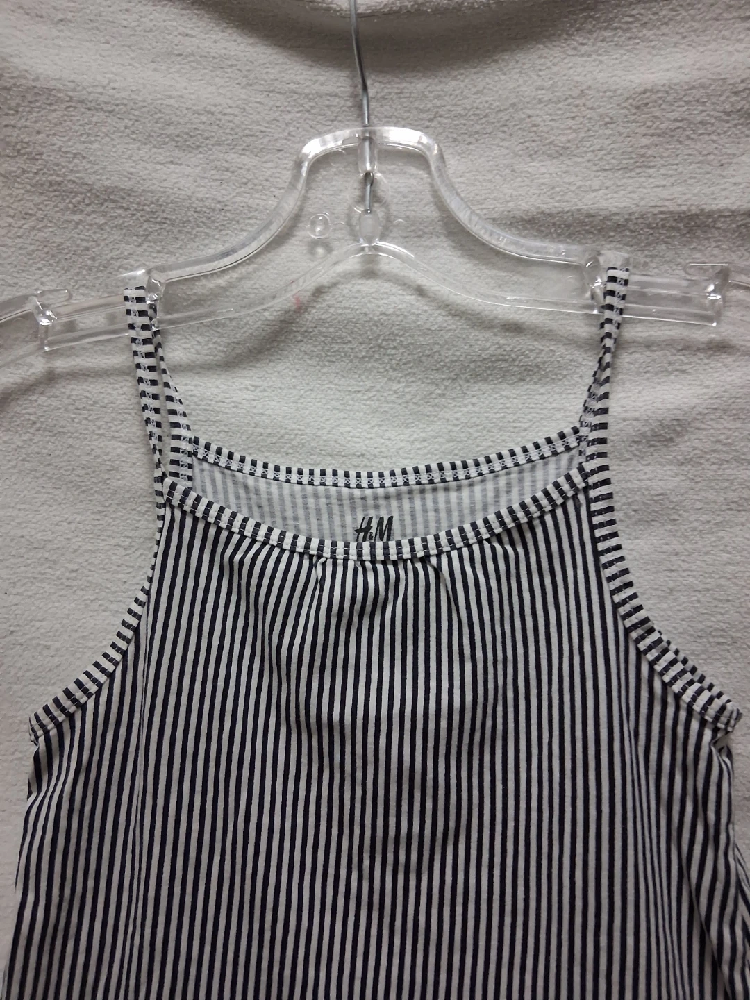 This is a Girls:Size 6/8 years old H&M dress with a navy and white stripe pattern. It features a ruffled hemline and thin spaghetti straps. Made in Bangladesh.
