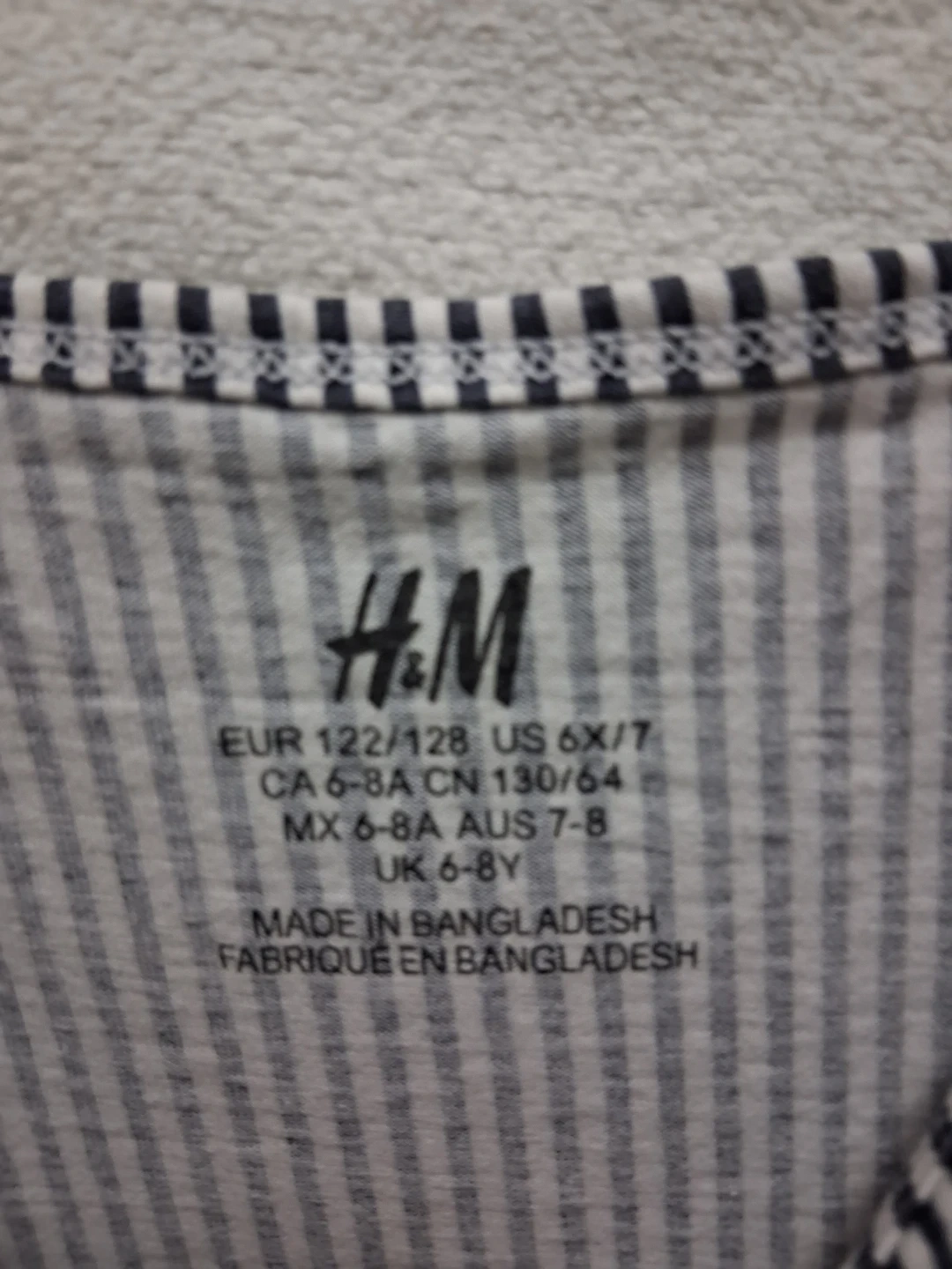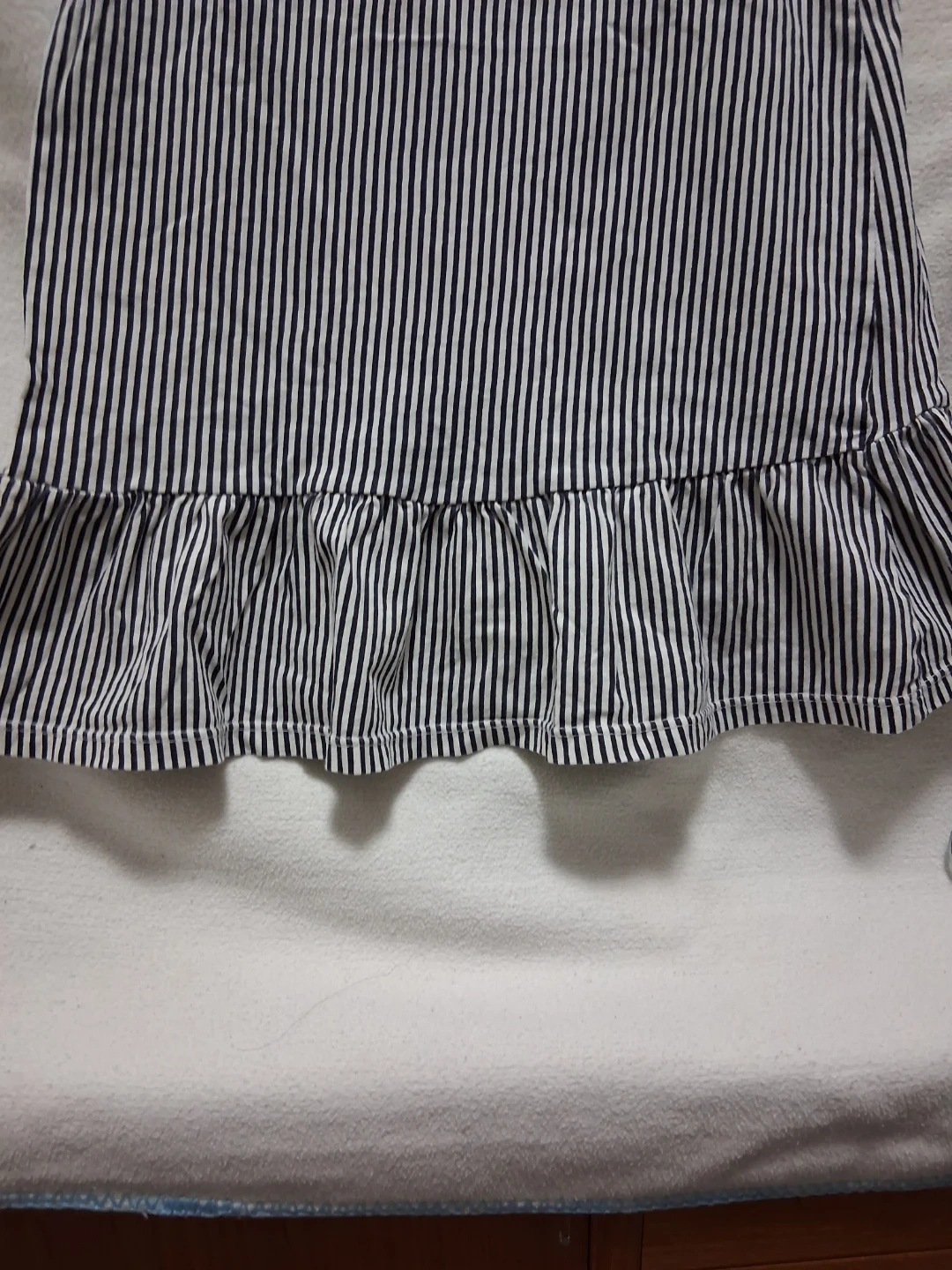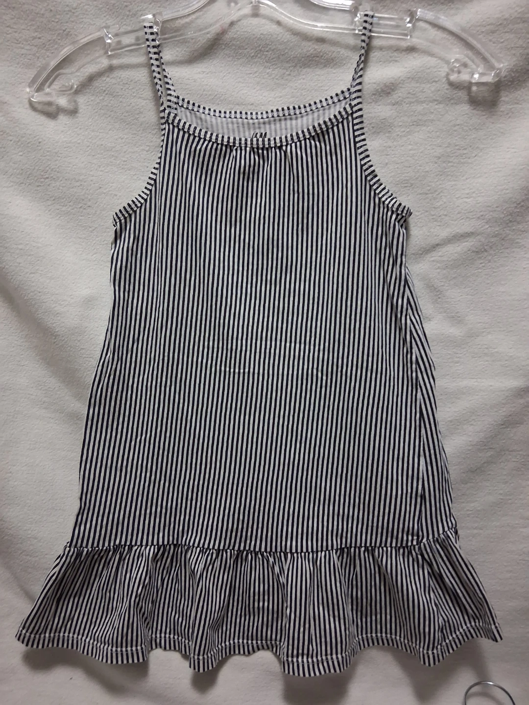 This is a Girls:Size 6/8 years old H&M dress with a navy and white stripe pattern. It features a ruffled hemline and thin spaghetti straps. Made in Bangladesh.