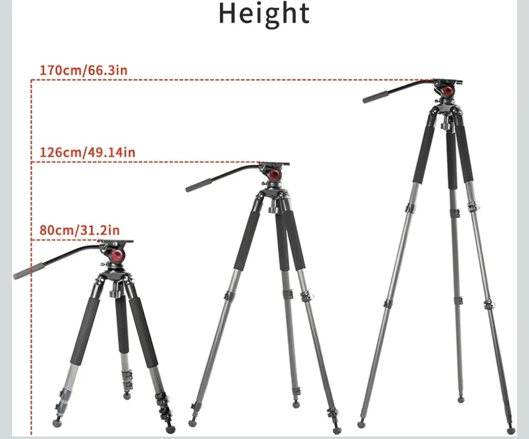 The tripod has a 15.7" minimum height, and it extends to a maximum height of 66.9". The fluid head features a 360° pan rotation and a +90/-70° tilt range, and it includes a pan bar and bubble level to make balance and movement smooth and easy. The full tripod and fluid head kit weighs 9.6 lb.