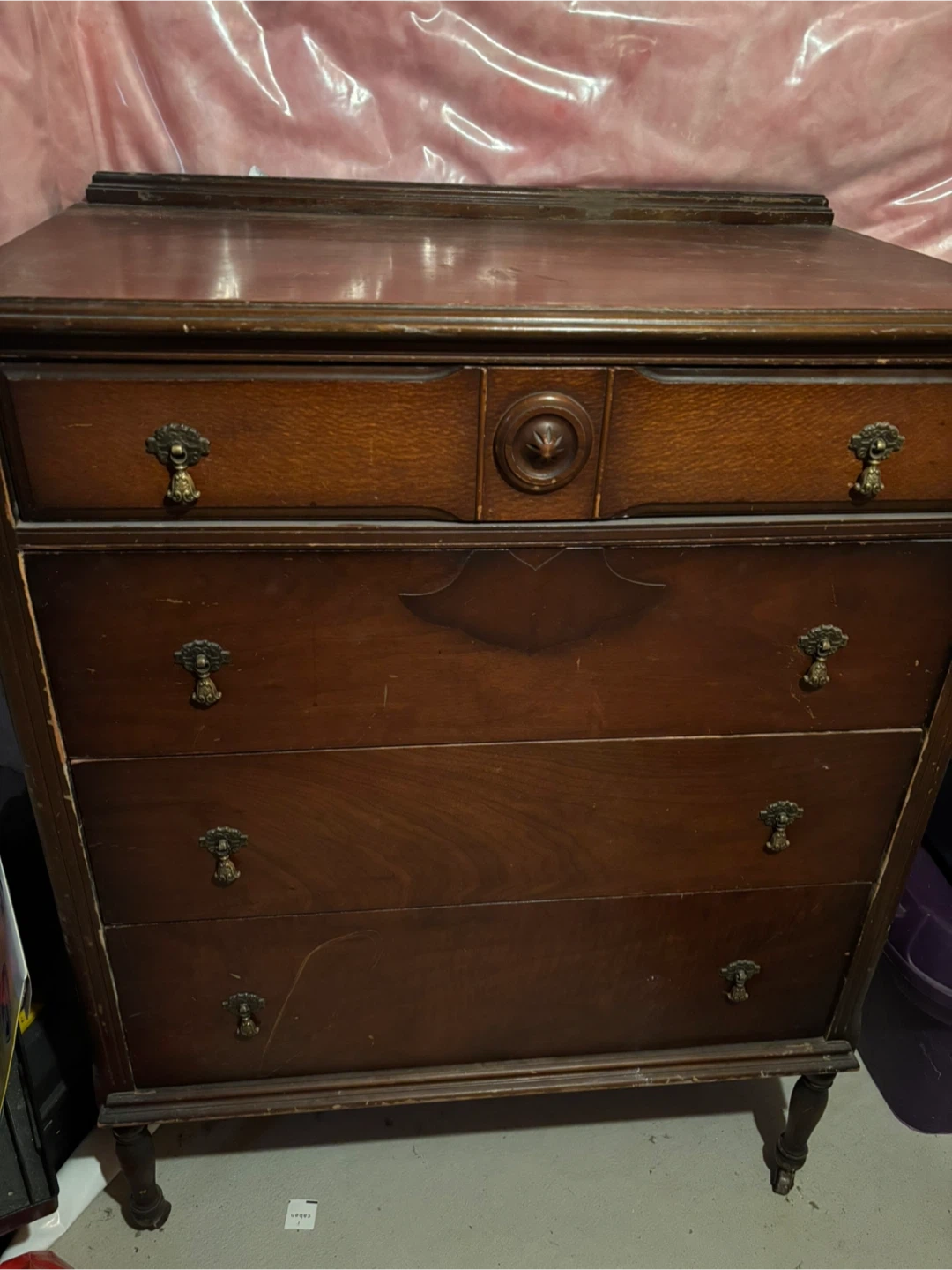 This is a vintage dresser by Bell Southampton. It's made of dark wood with ornate brass handles. It has four drawers for storage. This dresser would be useful for storing clothes or other household items.rich looking piece for any room.