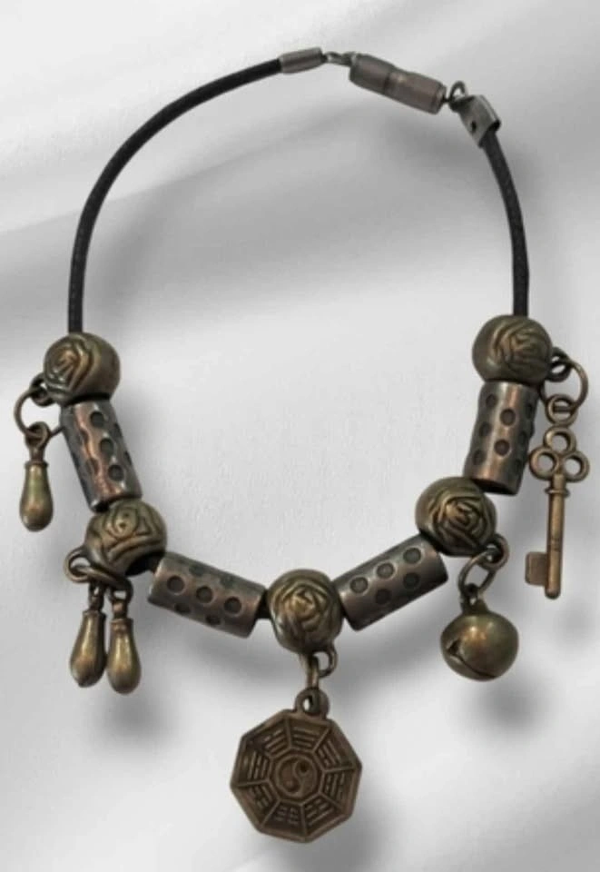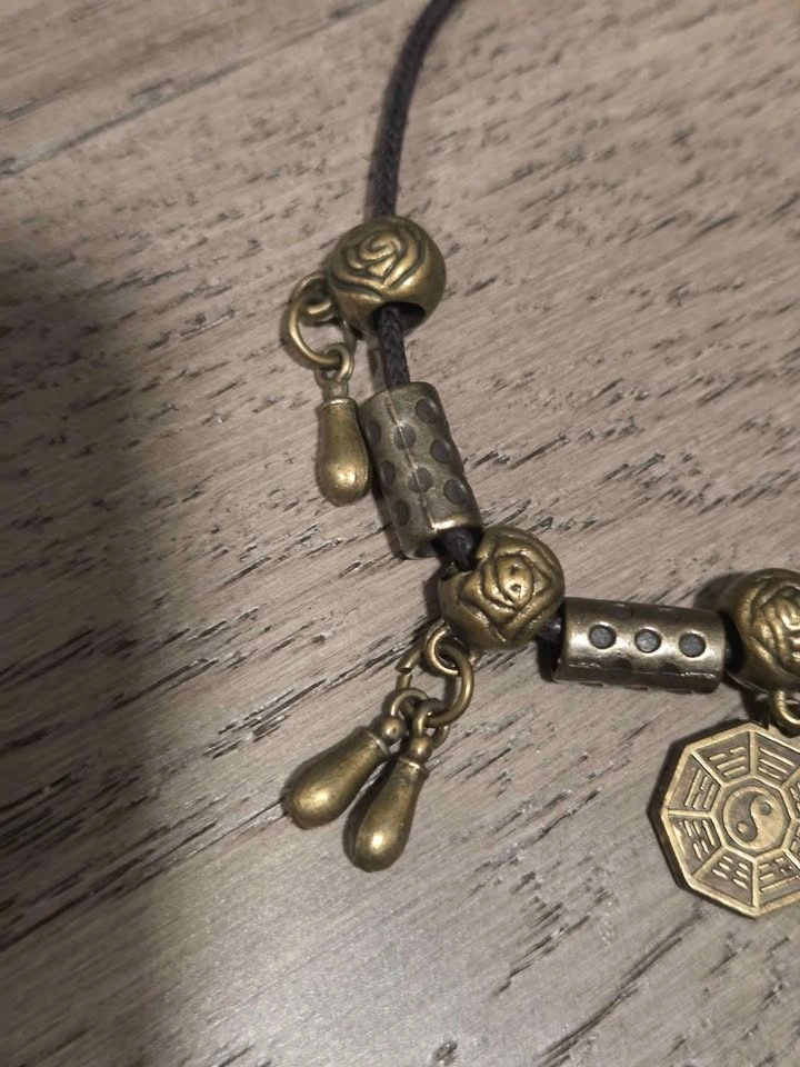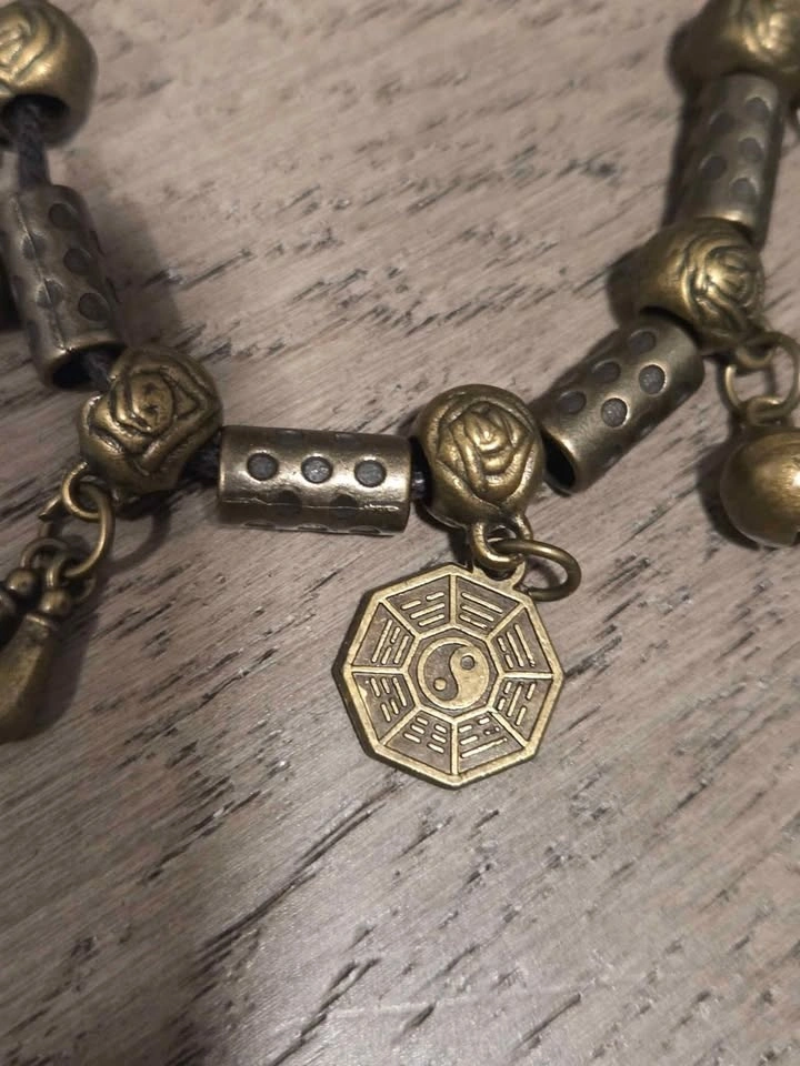 Unique vintage Chinese-style brass charm bracelet. Features a Yin Yang Bagua charm, lucky key, bell, and decorative brass beads. It has a beautiful aged patina with a boho/spiritual look. Comfortable black cord with a metal clasp closure. This is a great statement piece for everyday wear or as a meaningful gift.