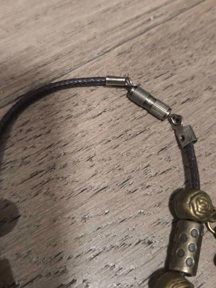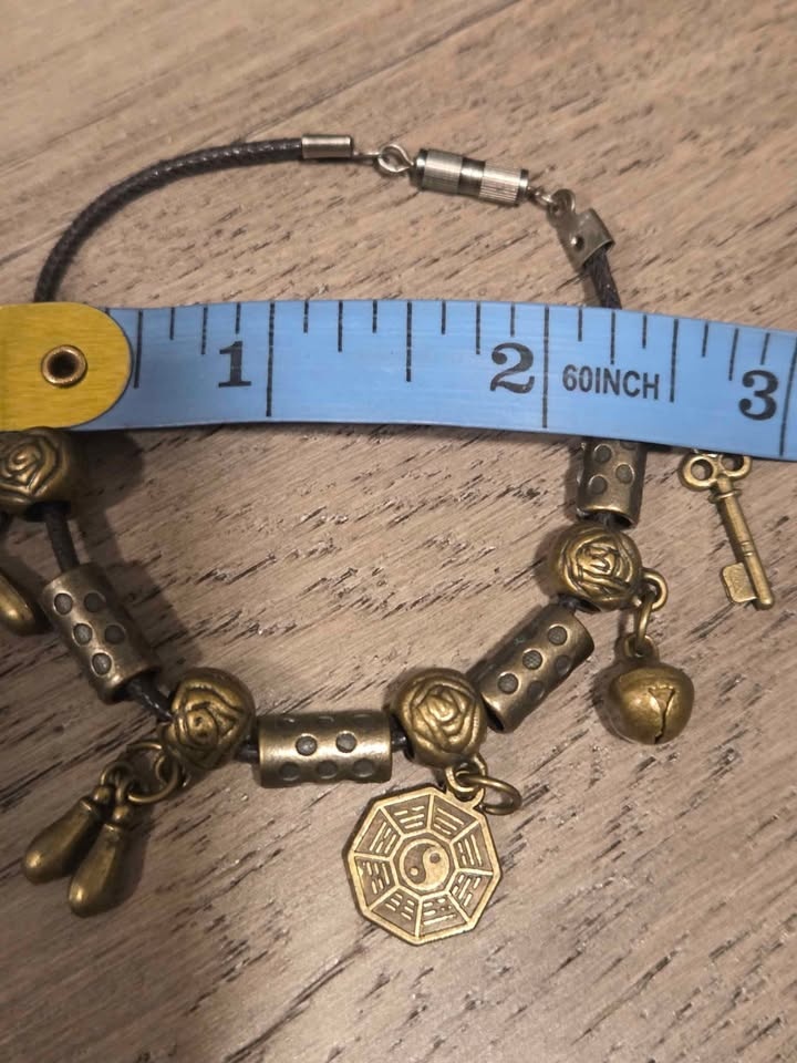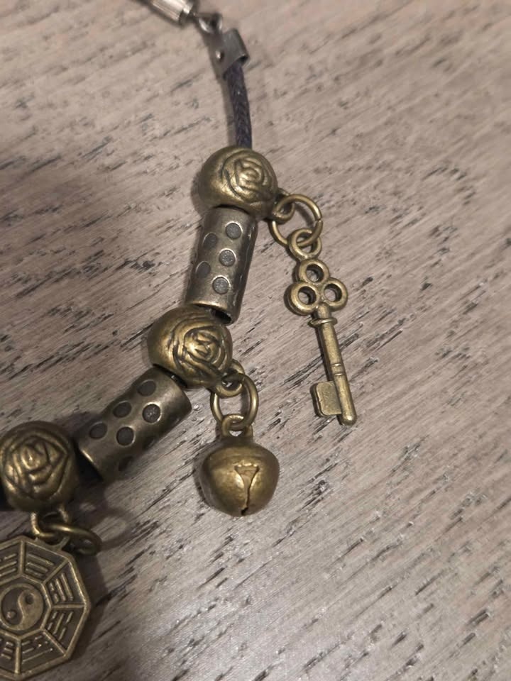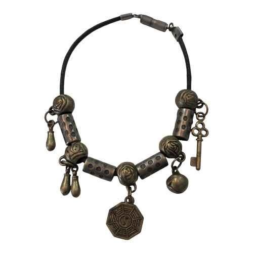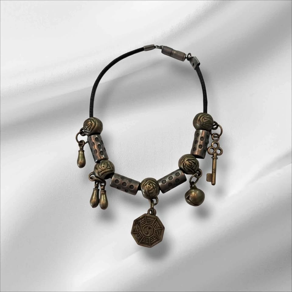 Unique vintage Chinese-style brass charm bracelet. Features a Yin Yang Bagua charm, lucky key, bell, and decorative brass beads. It has a beautiful aged patina with a boho/spiritual look. Comfortable black cord with a metal clasp closure. This is a great statement piece for everyday wear or as a meaningful gift.