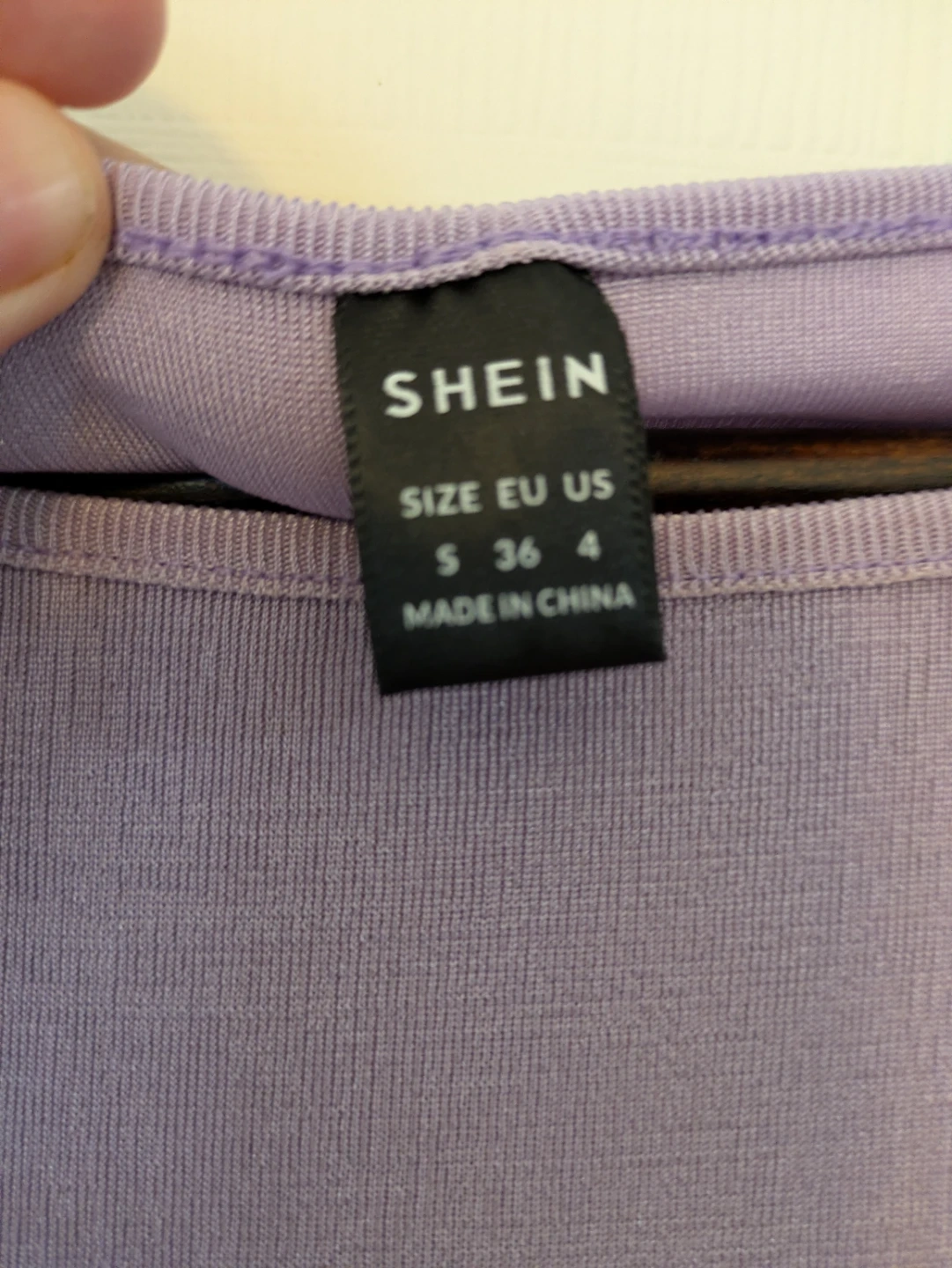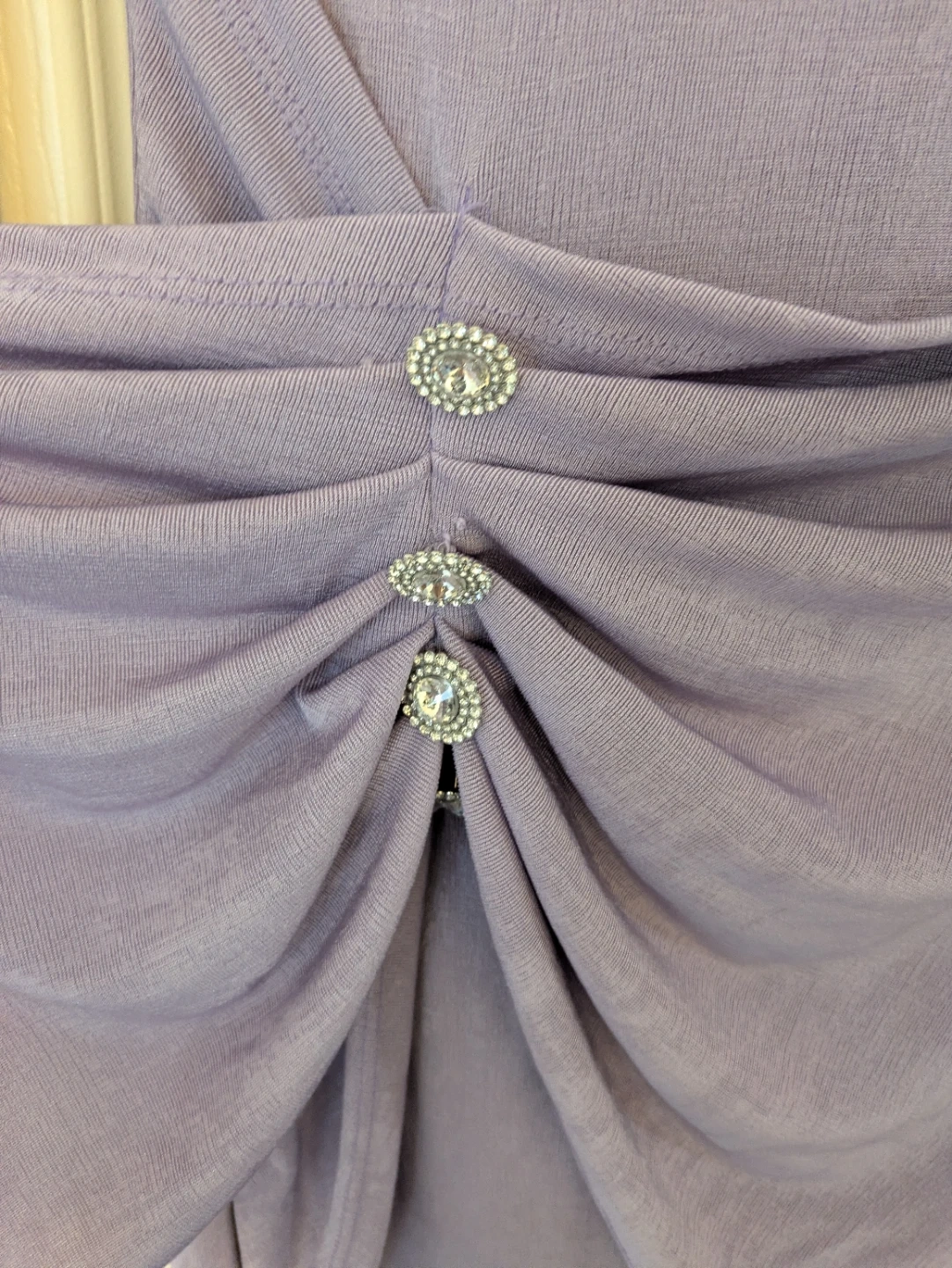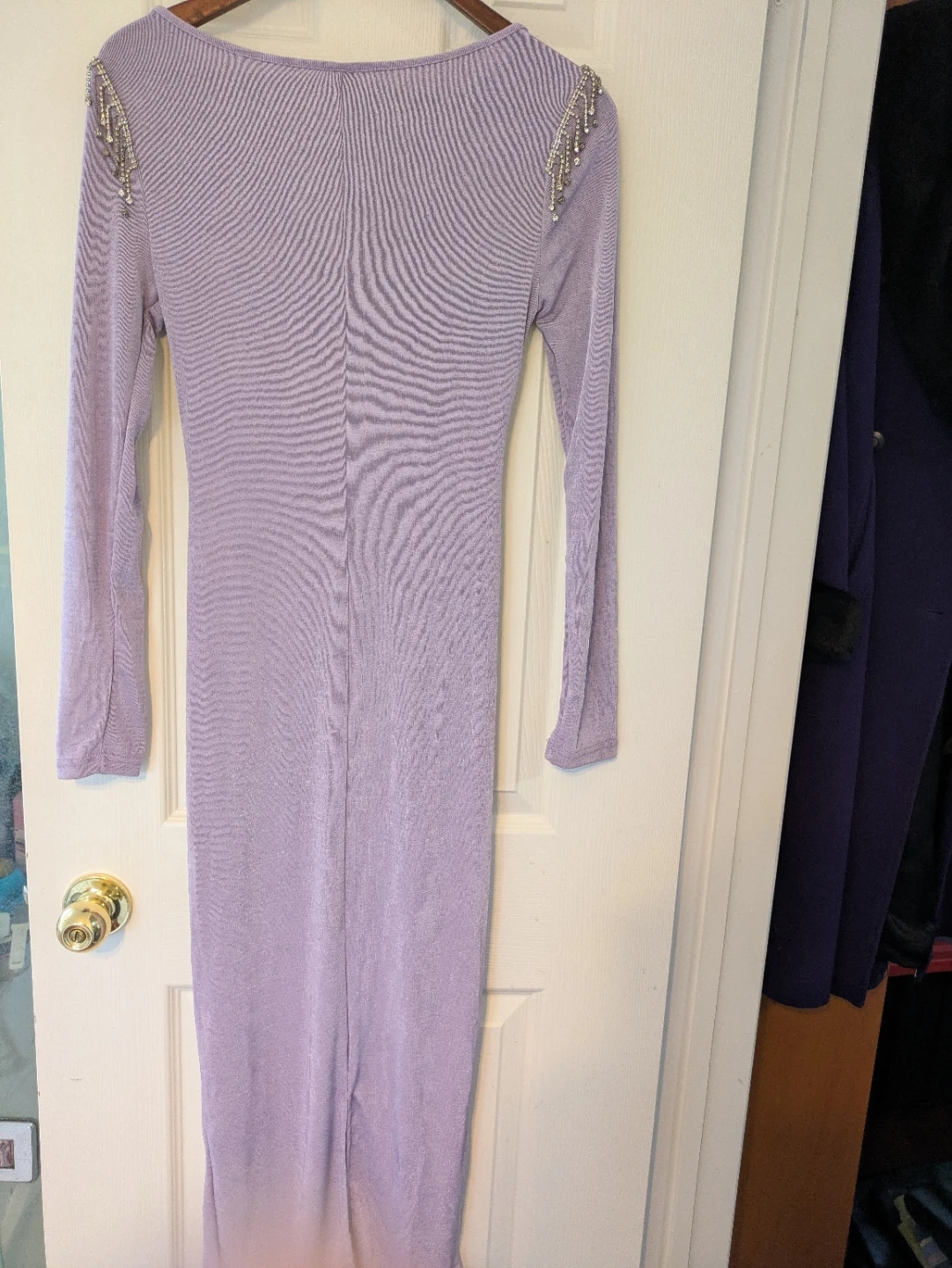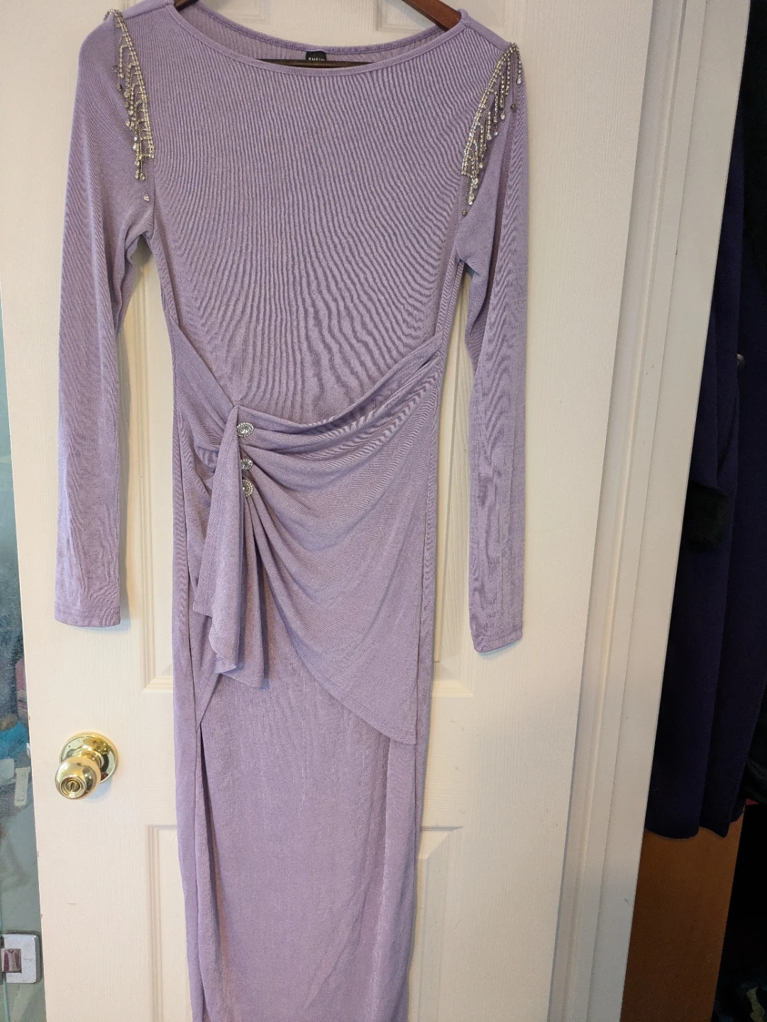 This is a lavender long-sleeve dress from Shein. It features rhinestone embellishments on the shoulders and a ruched detailing at the front with decorative buttons. The size is S (US 4, EU 36).