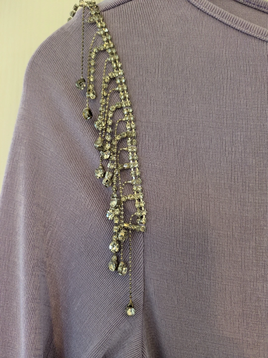 This is a lavender long-sleeve dress from Shein. It features rhinestone embellishments on the shoulders and a ruched detailing at the front with decorative buttons. The size is S (US 4, EU 36).