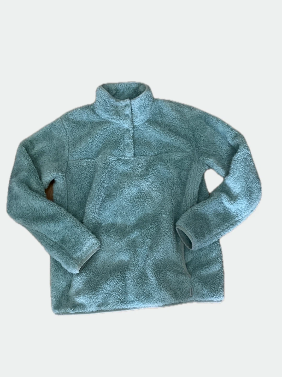 This is an Eddie Bauer women's fleece pullover in a soft, light blue colour. It's a size small with a snap-button collar and pockets on the sides. This comfy sweater is perfect for staying warm on cooler days!