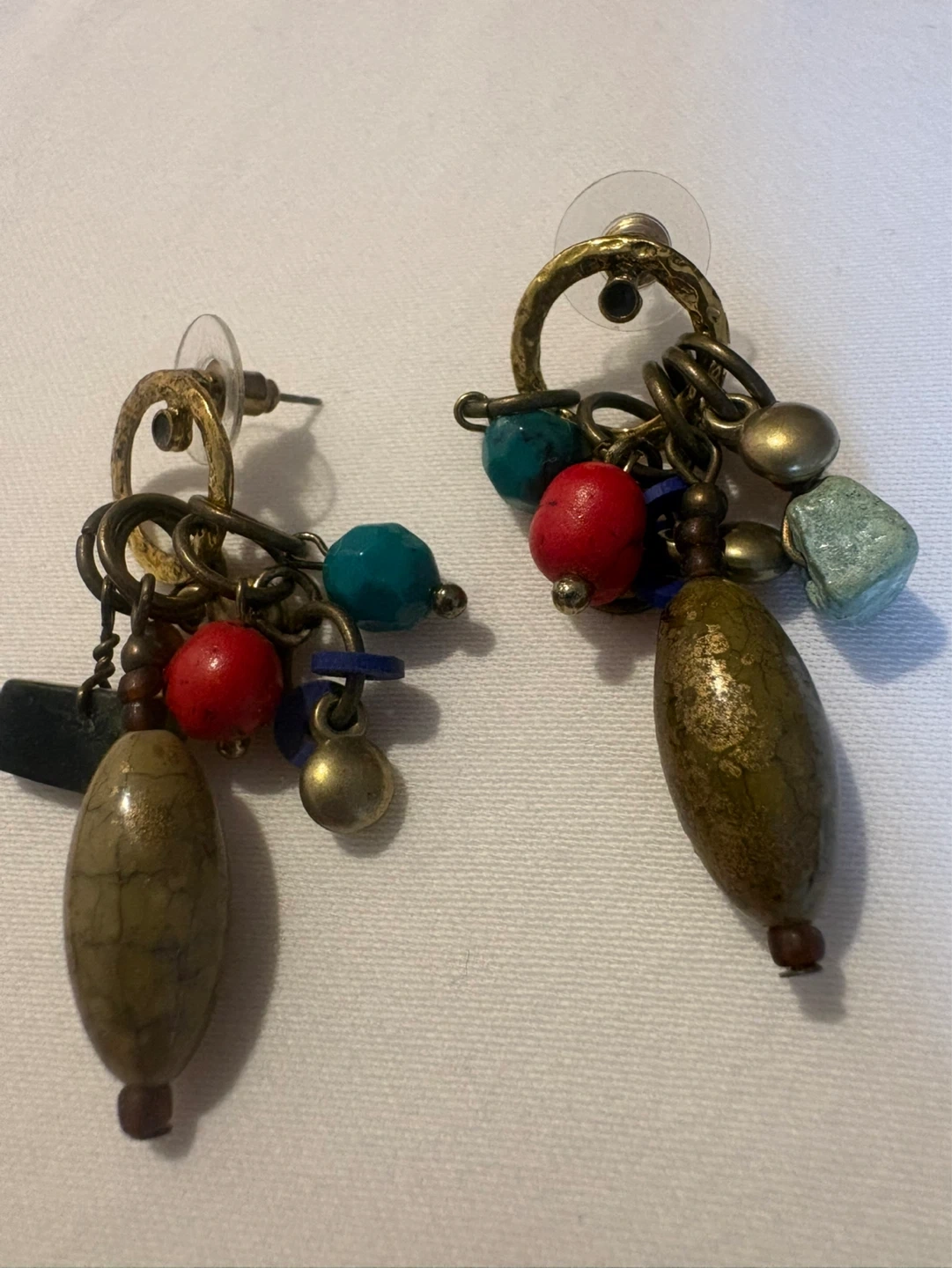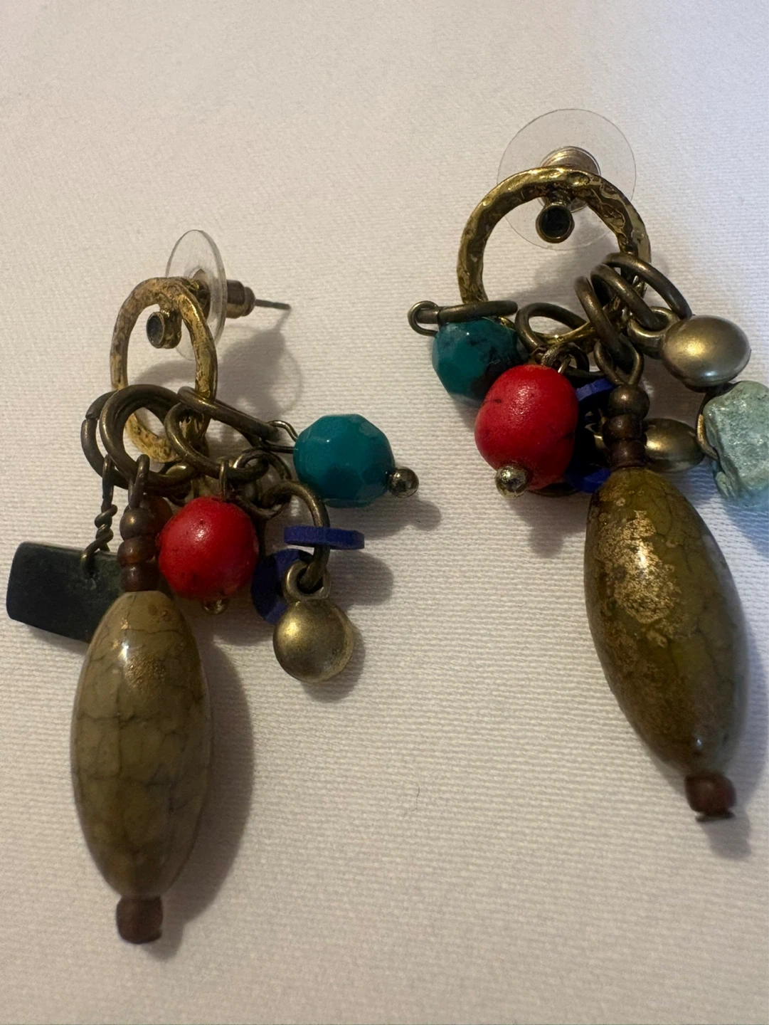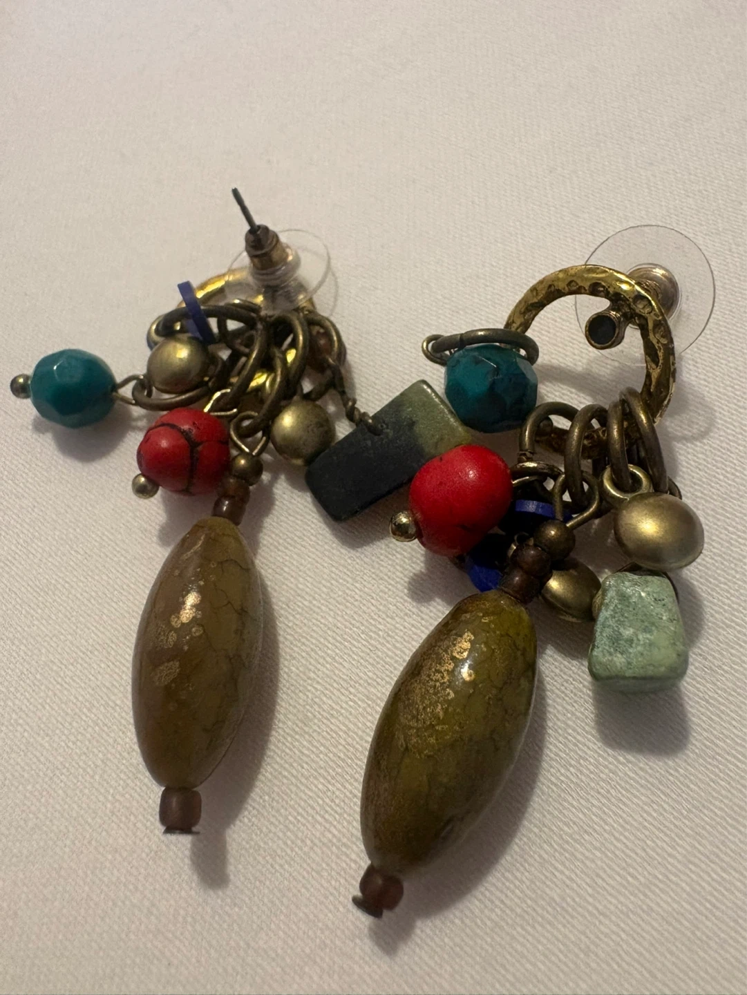 These fun vintage dangle earrings feature a variety of beads and gemstones in earthy tones and pops of red and turquoise.