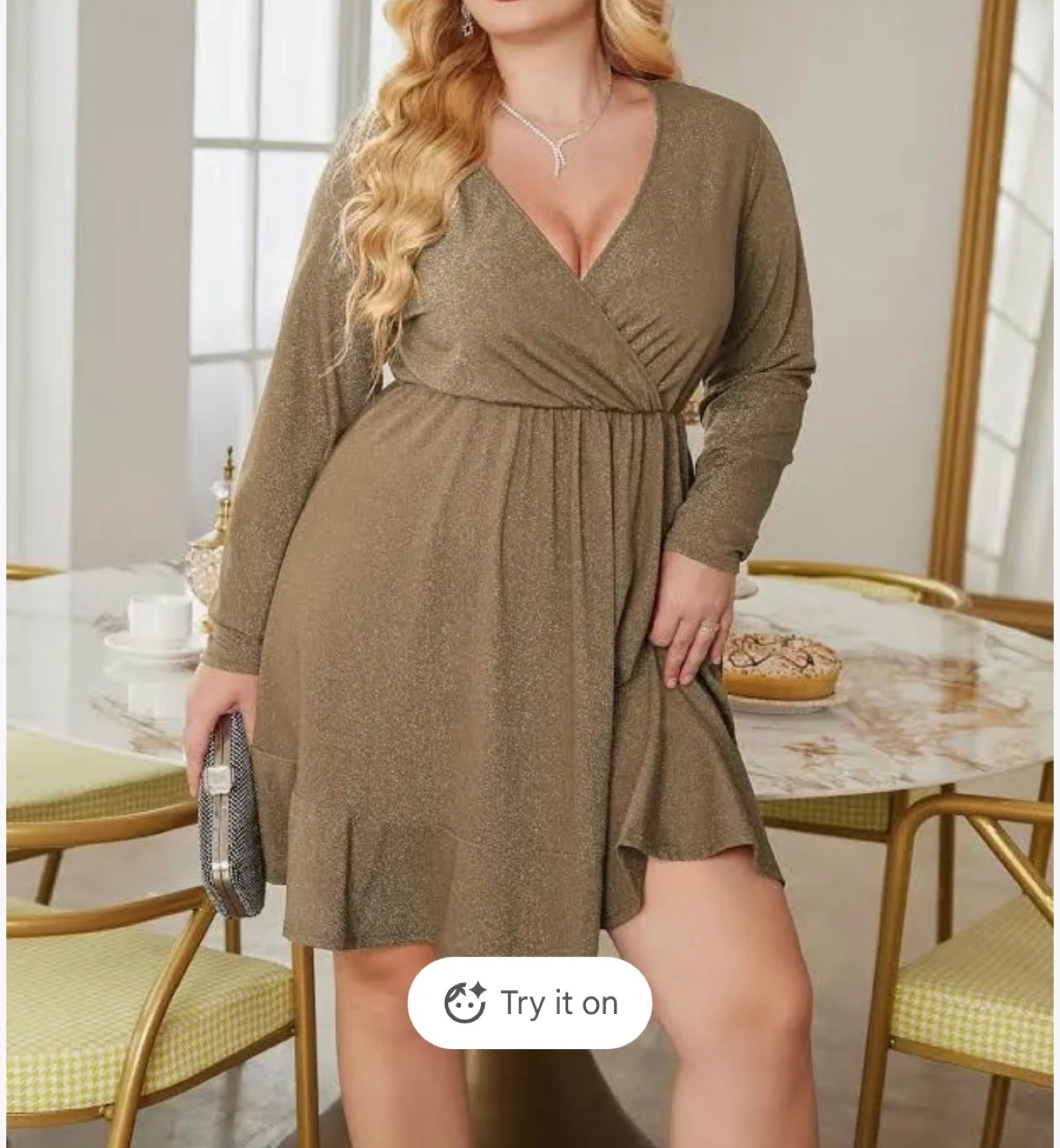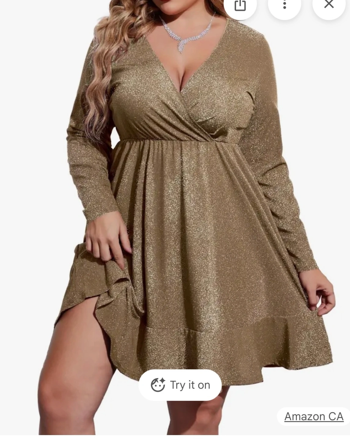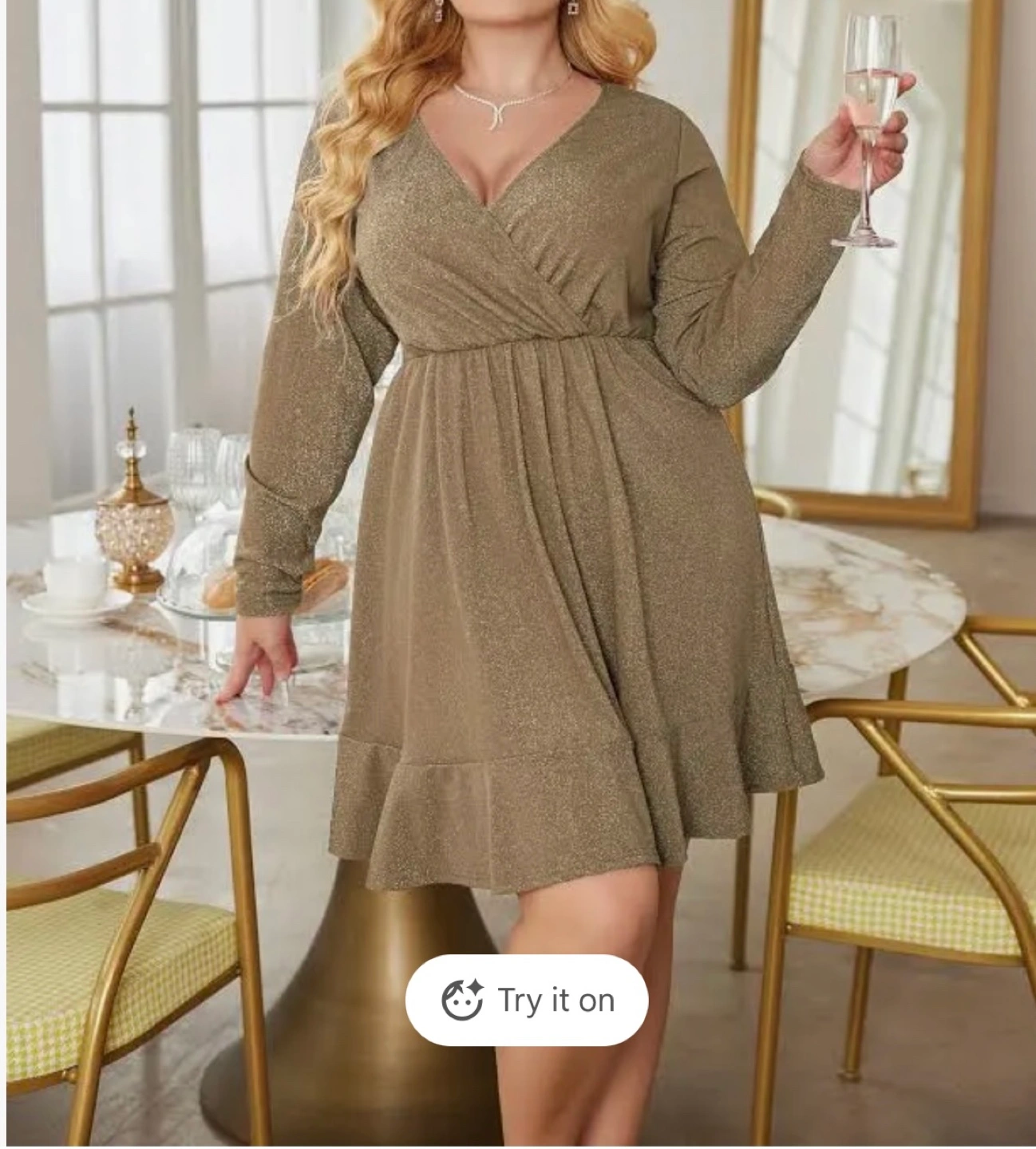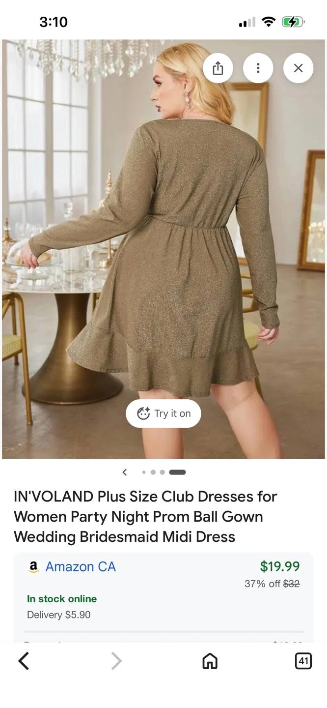 This IN'VOLAND dress features a flattering wrap front and a shimmering sparkle detail. It has a comfortable ruched waistband and a flounced hem. Made in China.