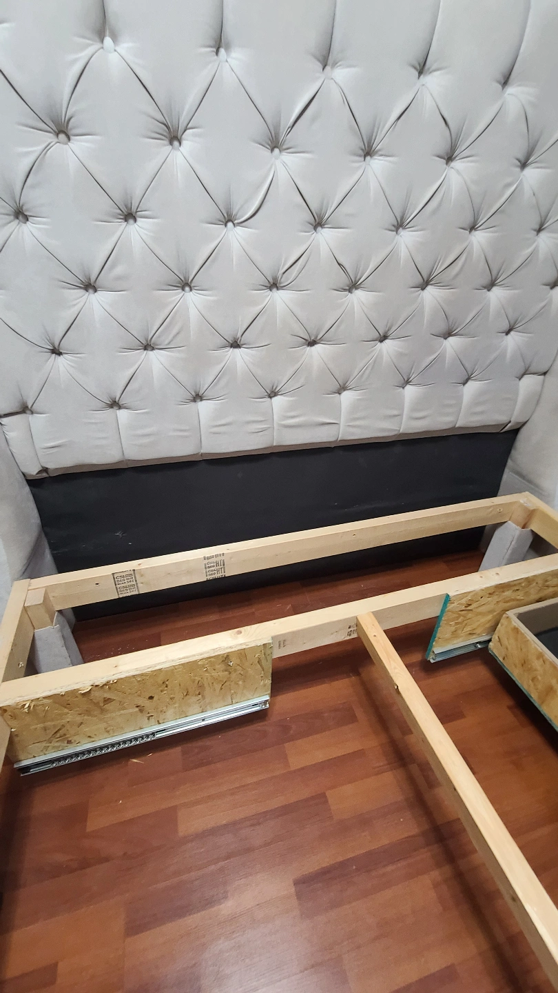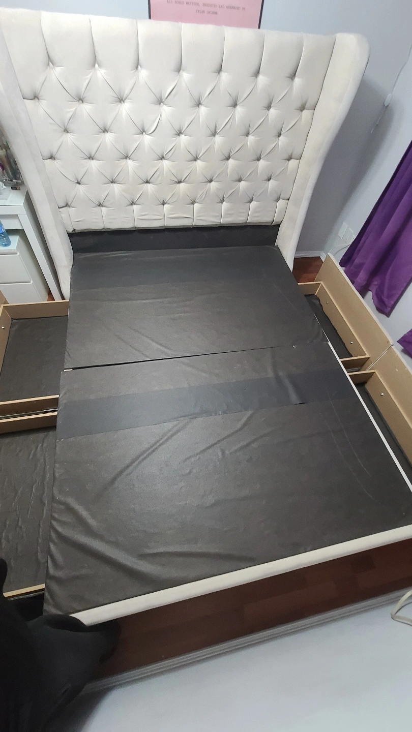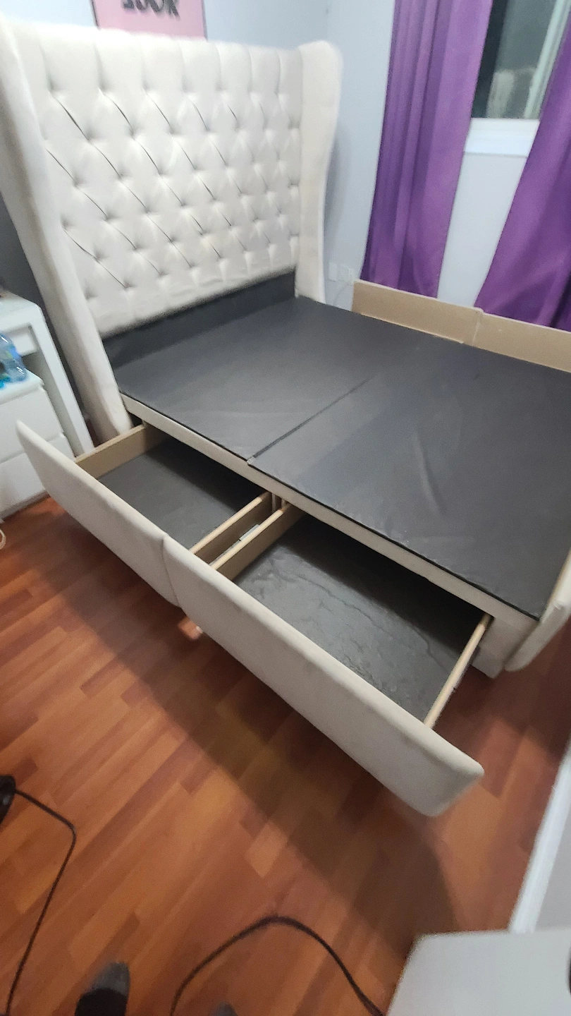 Queen size bed frame with Wingback headboard. Head board and drawers are upholstered in off-white fabric. Features four large storage drawers. Custom Solid wood frame still in 1 whole peice. Very clean, solid wood, from pet/smoke free home.