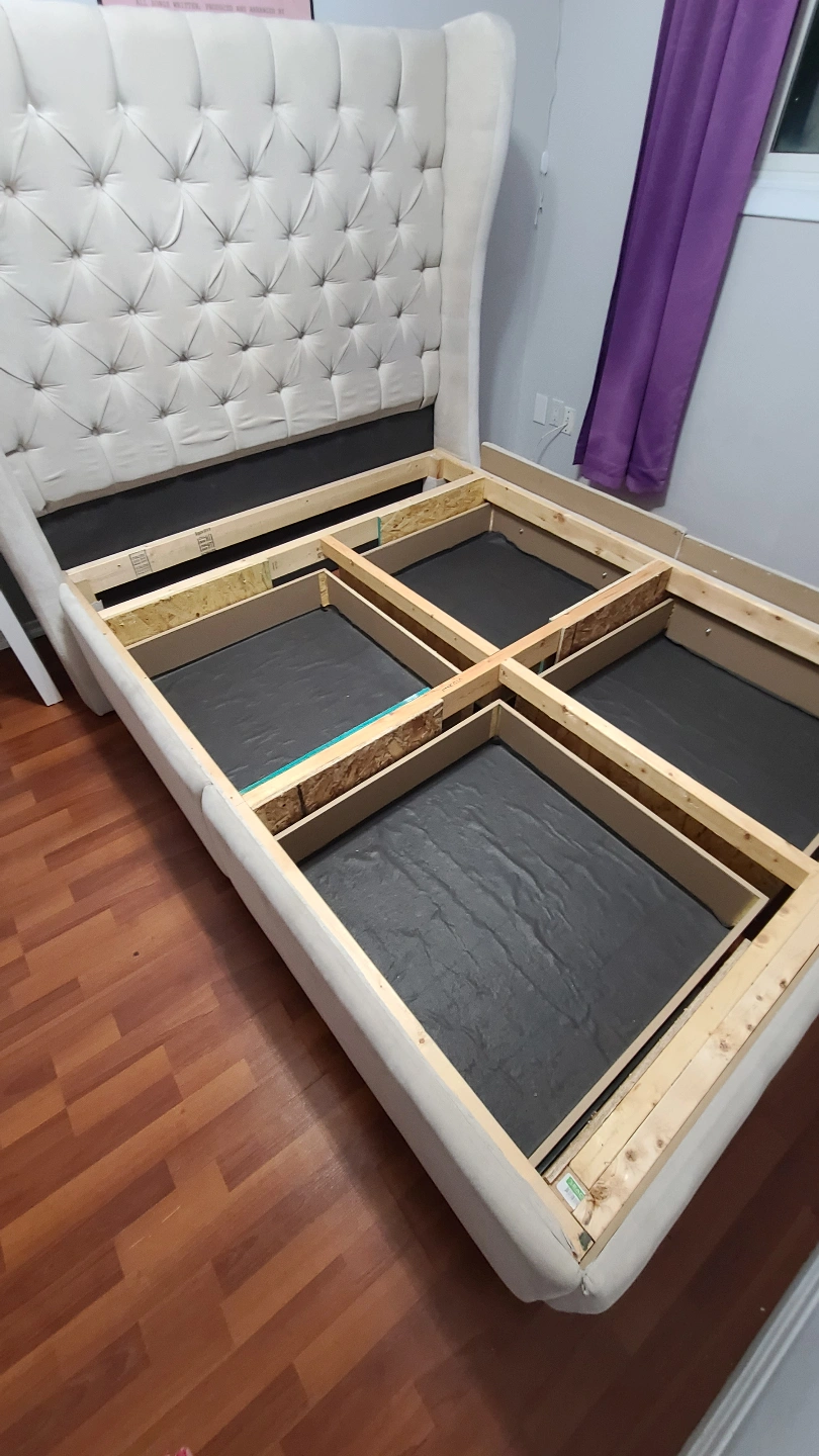 Queen size bed frame with Wingback headboard. Head board and drawers are upholstered in off-white fabric. Features four large storage drawers. Custom Solid wood frame still in 1 whole peice. Very clean, solid wood, from pet/smoke free home.