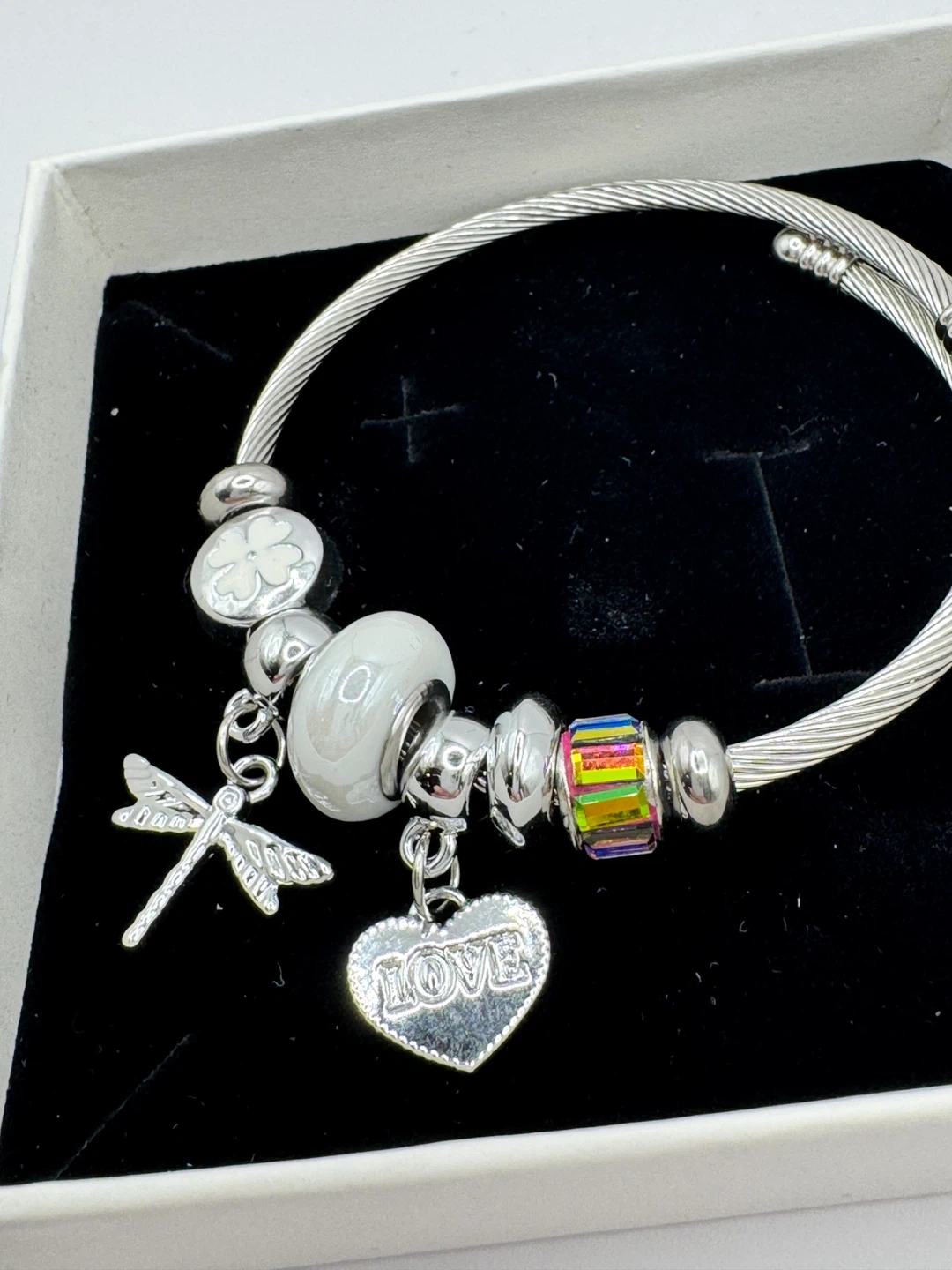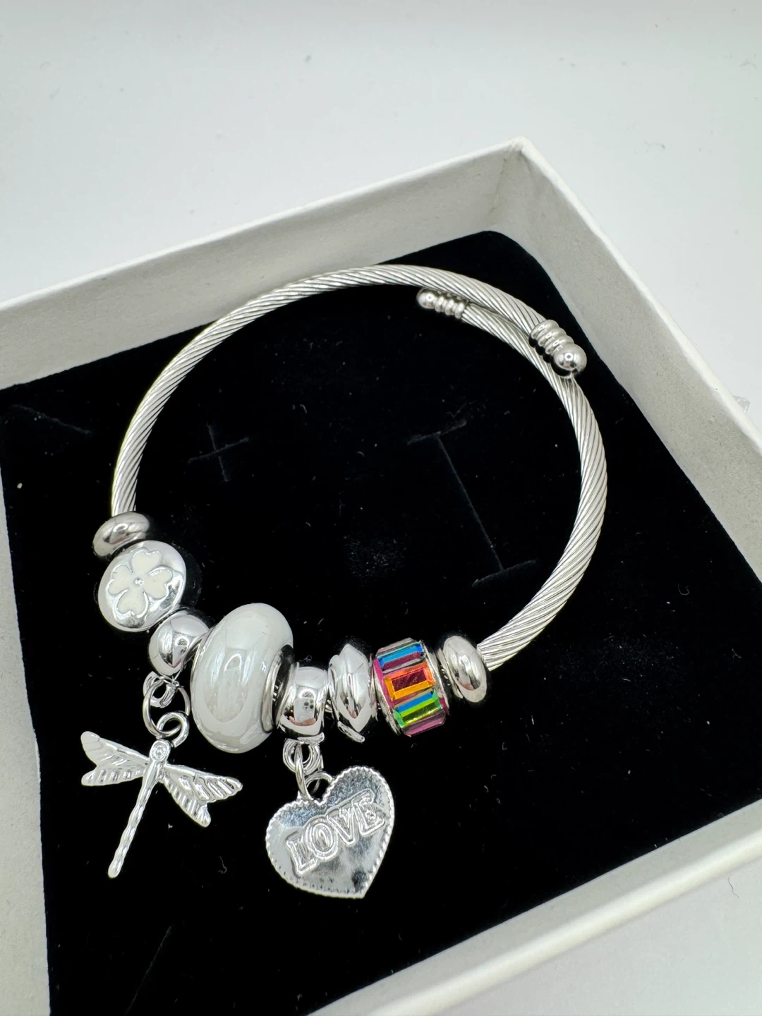 This is a silver-tone bangle bracelet adorned with several charms. It features a dragonfly, a clover with a white enamel centre, a large white bead, and a heart-shaped pendant engraved with 'LOVE'. A colourful rectangular bead adds a pop of colour. The bracelet comes presented in a white gift box.