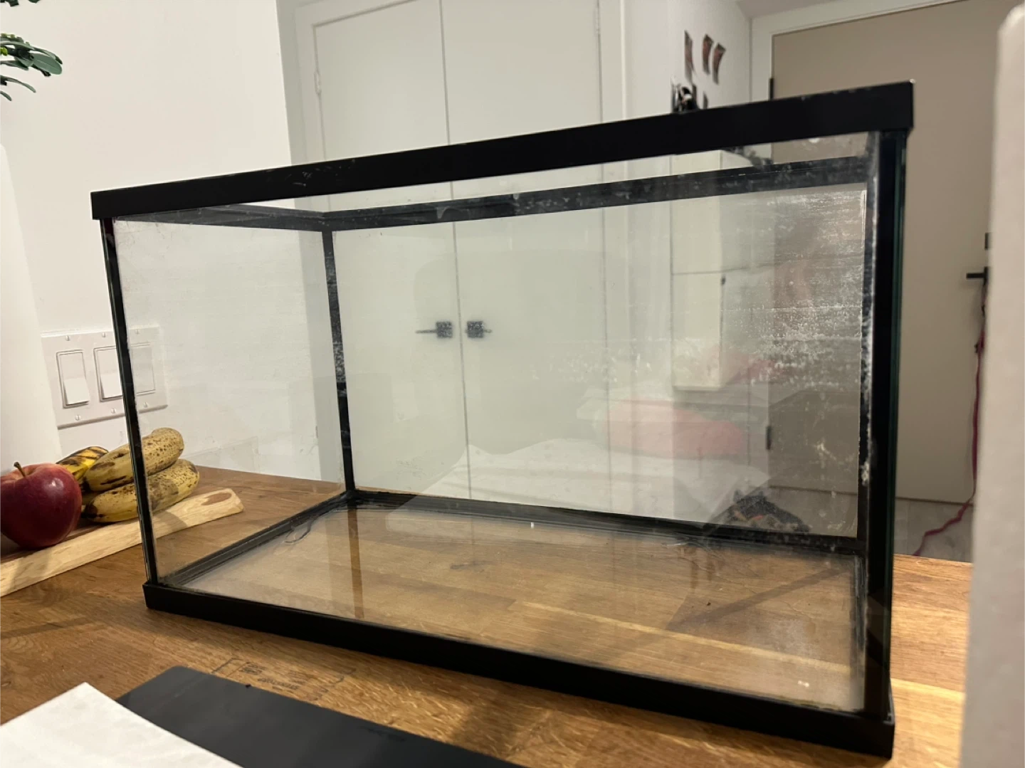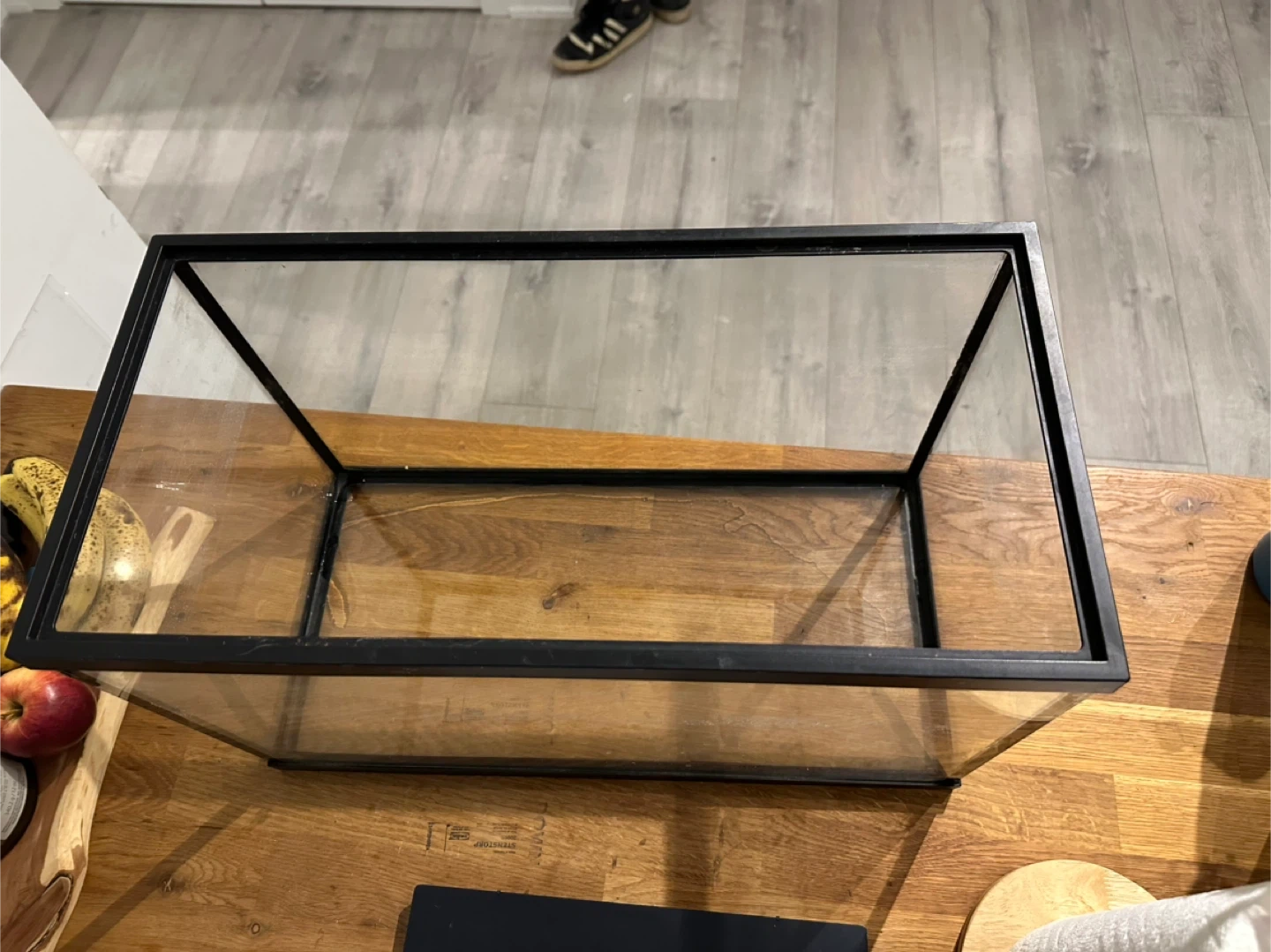 This is a glass terrarium tank with a black frame. It's suitable for small pets or plants. Dimensions are approximately 60cm long, 30cm wide, and 30cm high.