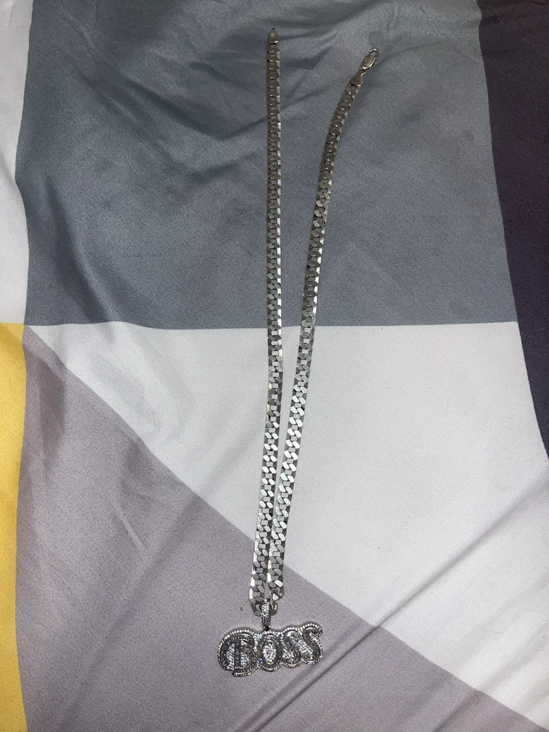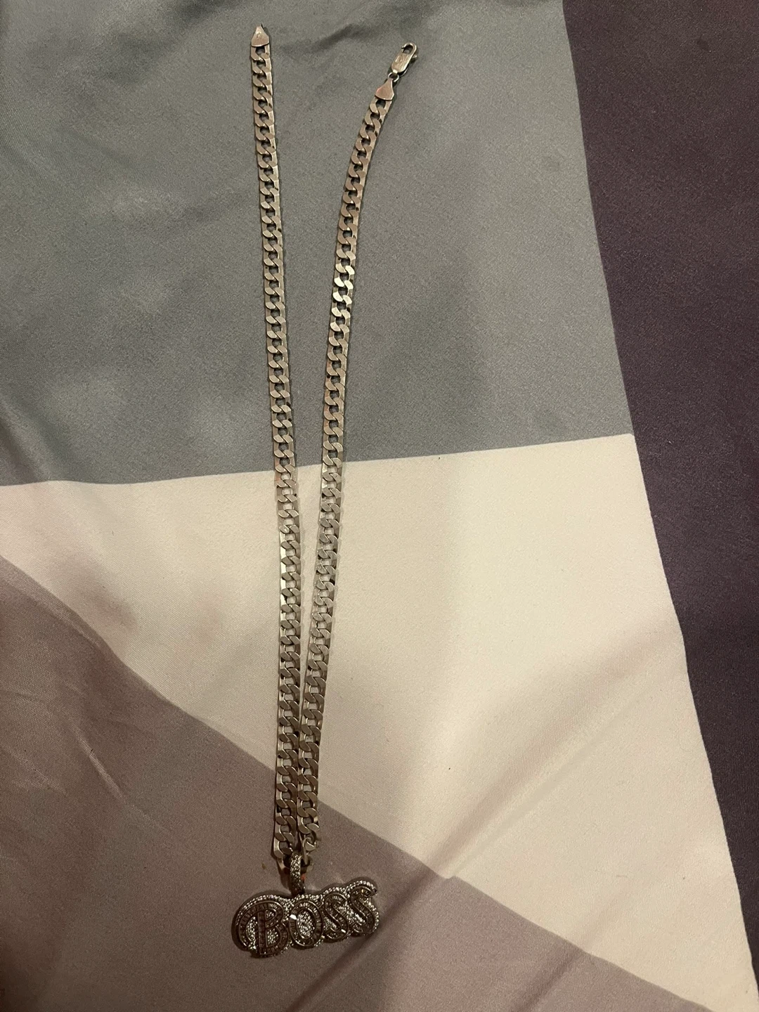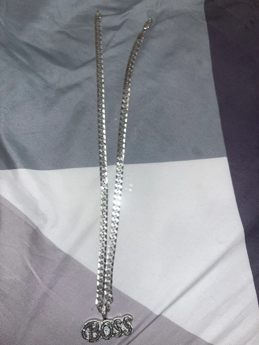 This necklace features a sterling silver chain with a "BOSS" pendant. It's stamped "925 ITALY" on the clasp. The chain's design is a cuban curb link.