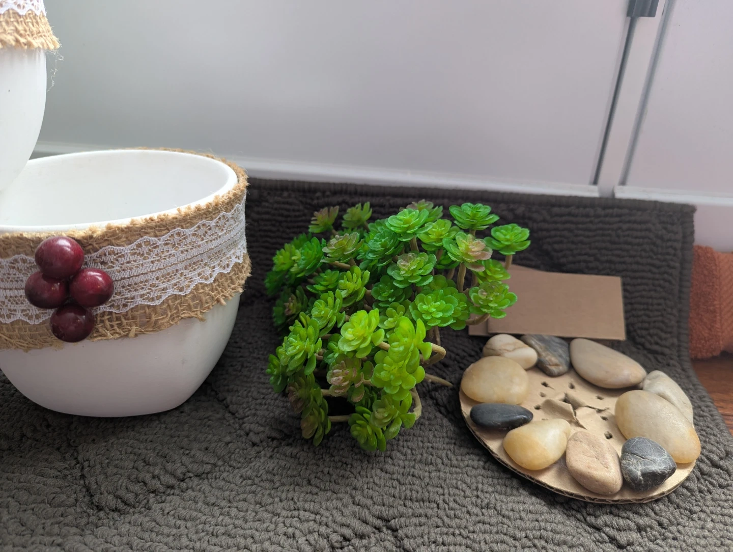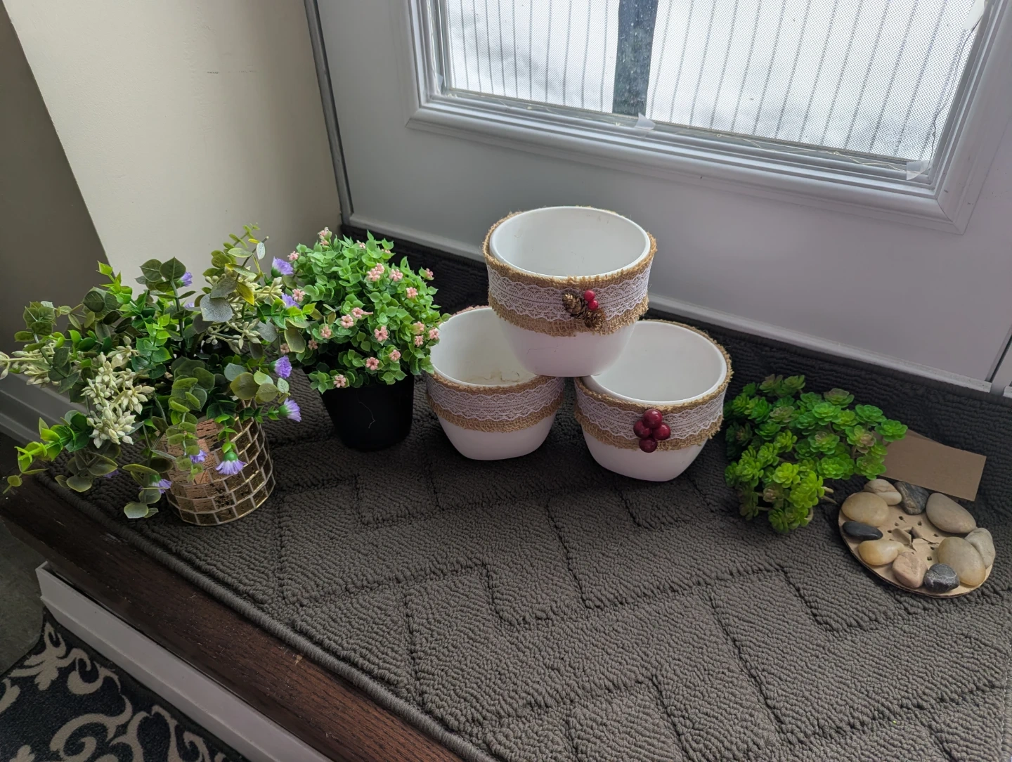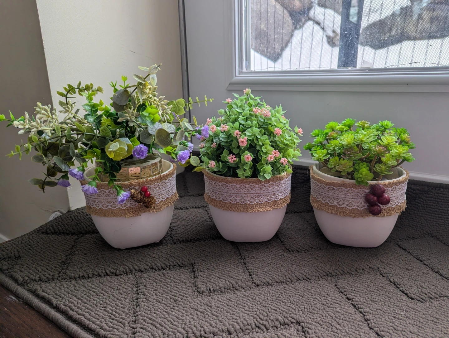 - 3 white ceramic planters, each decorated with burlap and lace trim and berry accents.