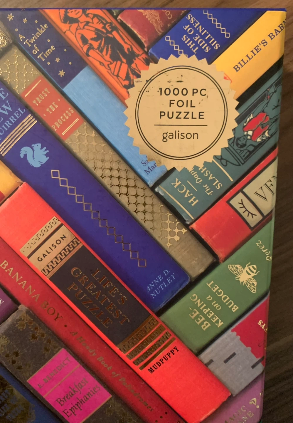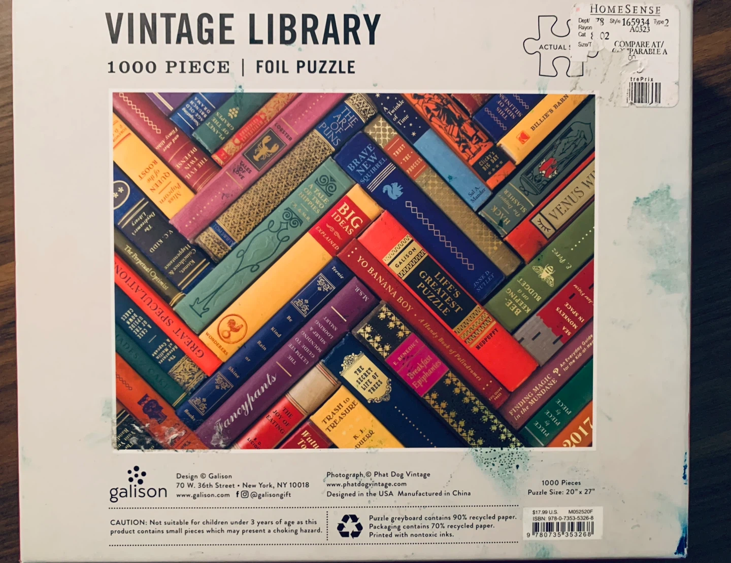 This 1000-piece jigsaw puzzle features a "Vintage Library" design with foil accents. It's made with 90% recycled paper and printed with nontoxic inks. The completed puzzle measures 20" x 27". Is complete, and comes with a poster.