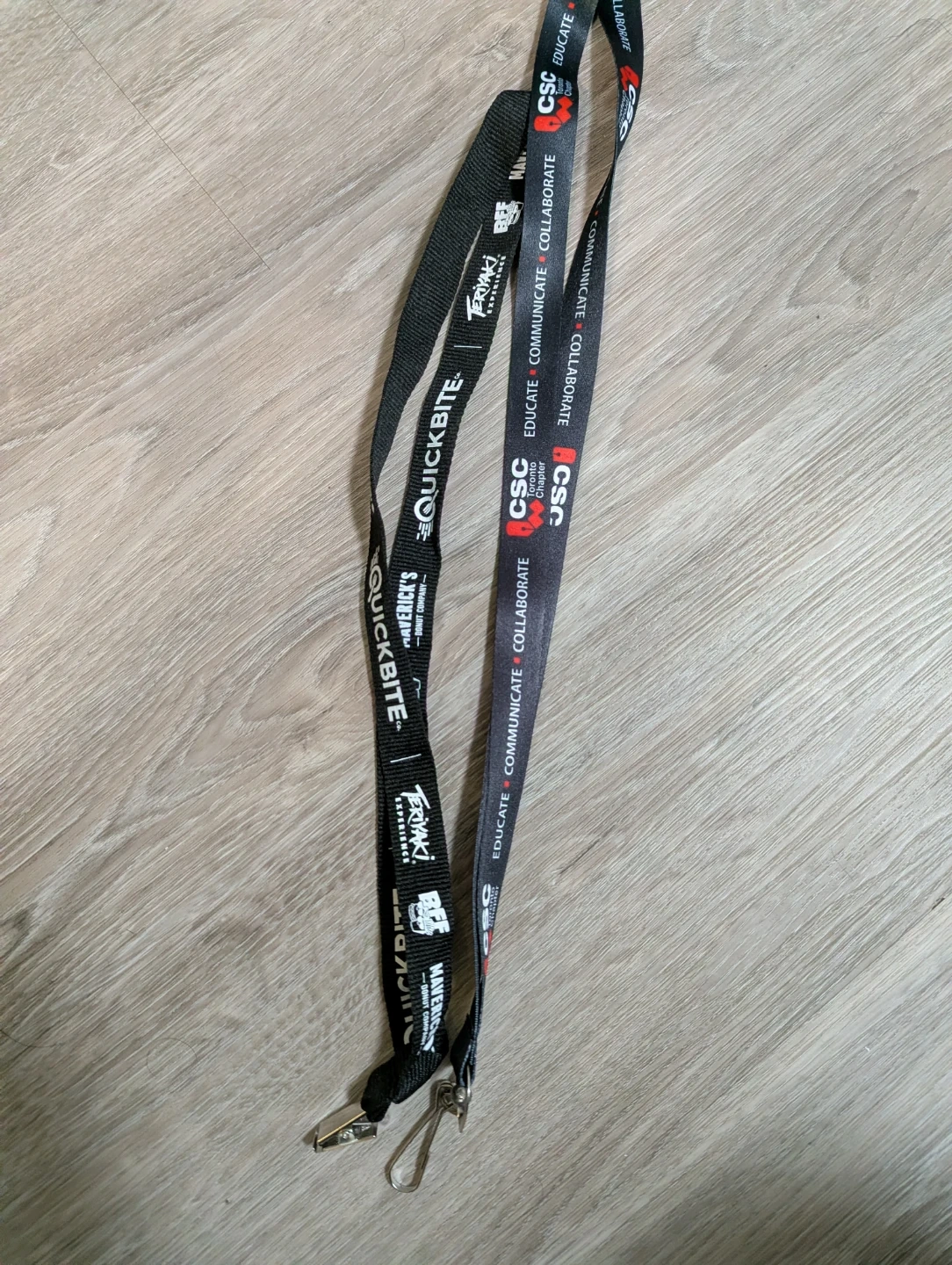 Two lanyards are available. One features Quickbite and Teriyaki Experience branding. The other has "Educate, Communicate, Collaborate" text and CSC Toronto Chapter logos. Both have metal clips.