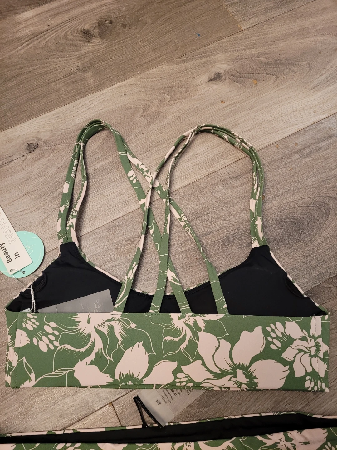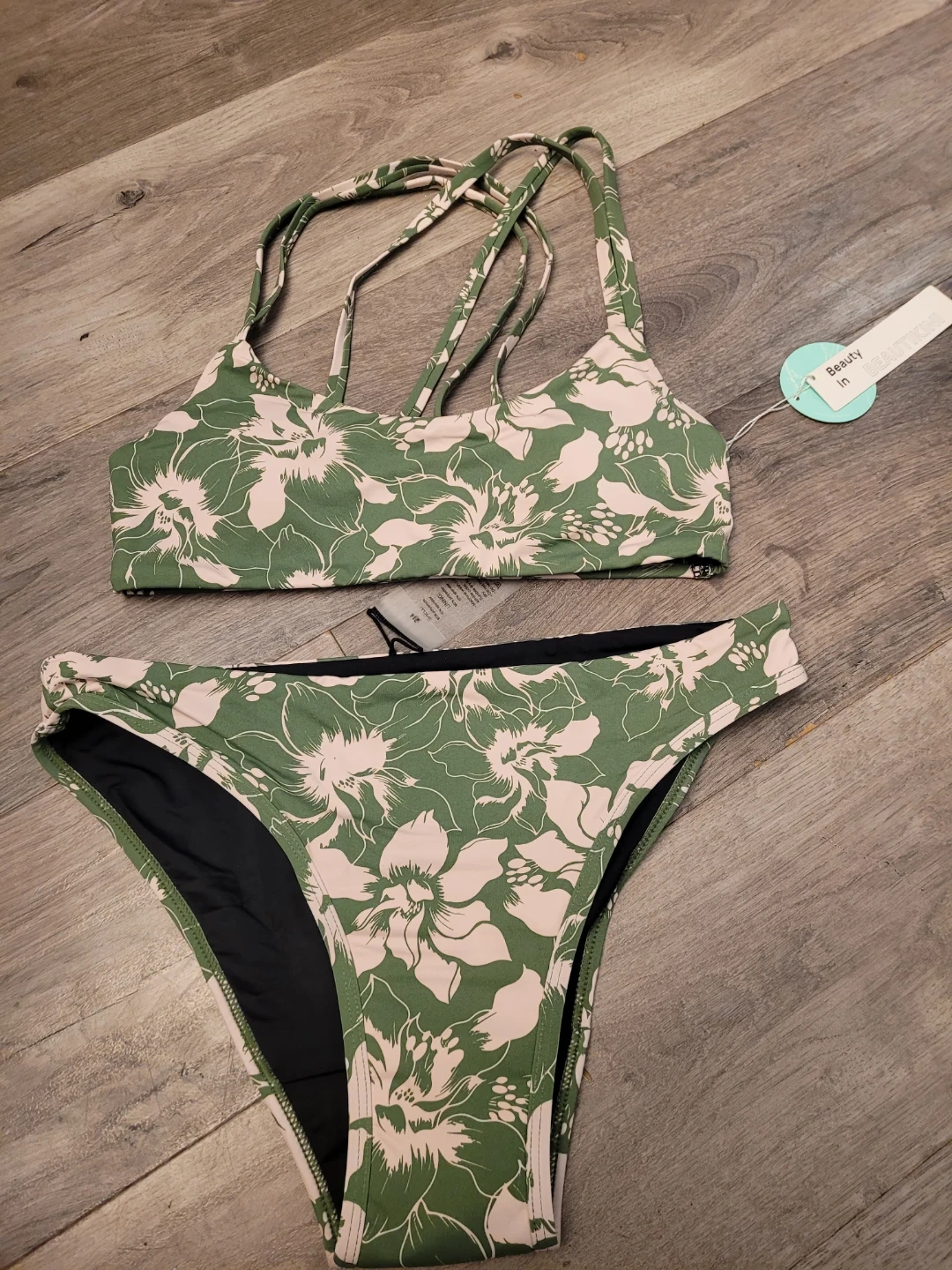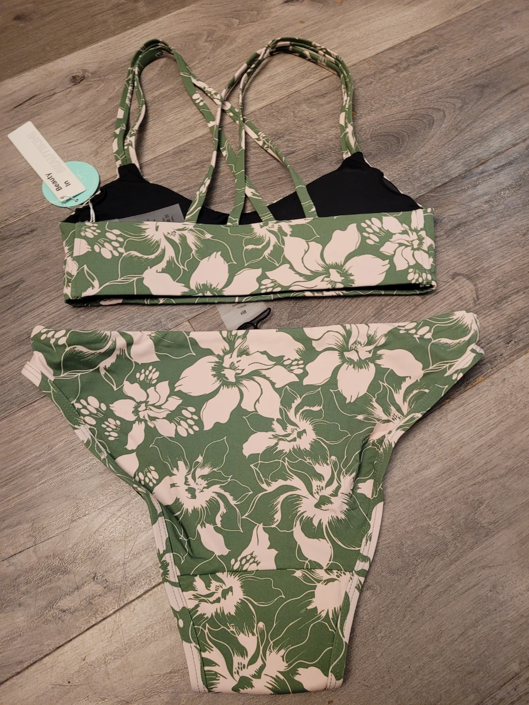 Green bikini set with a pink floral pattern. Features a criss-cross strap detail on the top. Never worn, tags attached. It has absorbancy so it can be worn during periods. XS size.