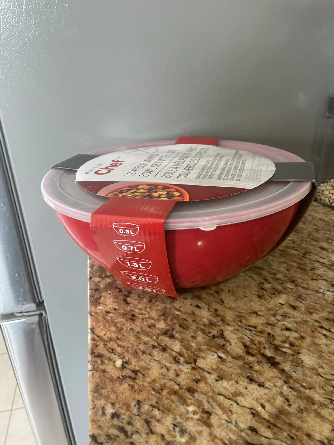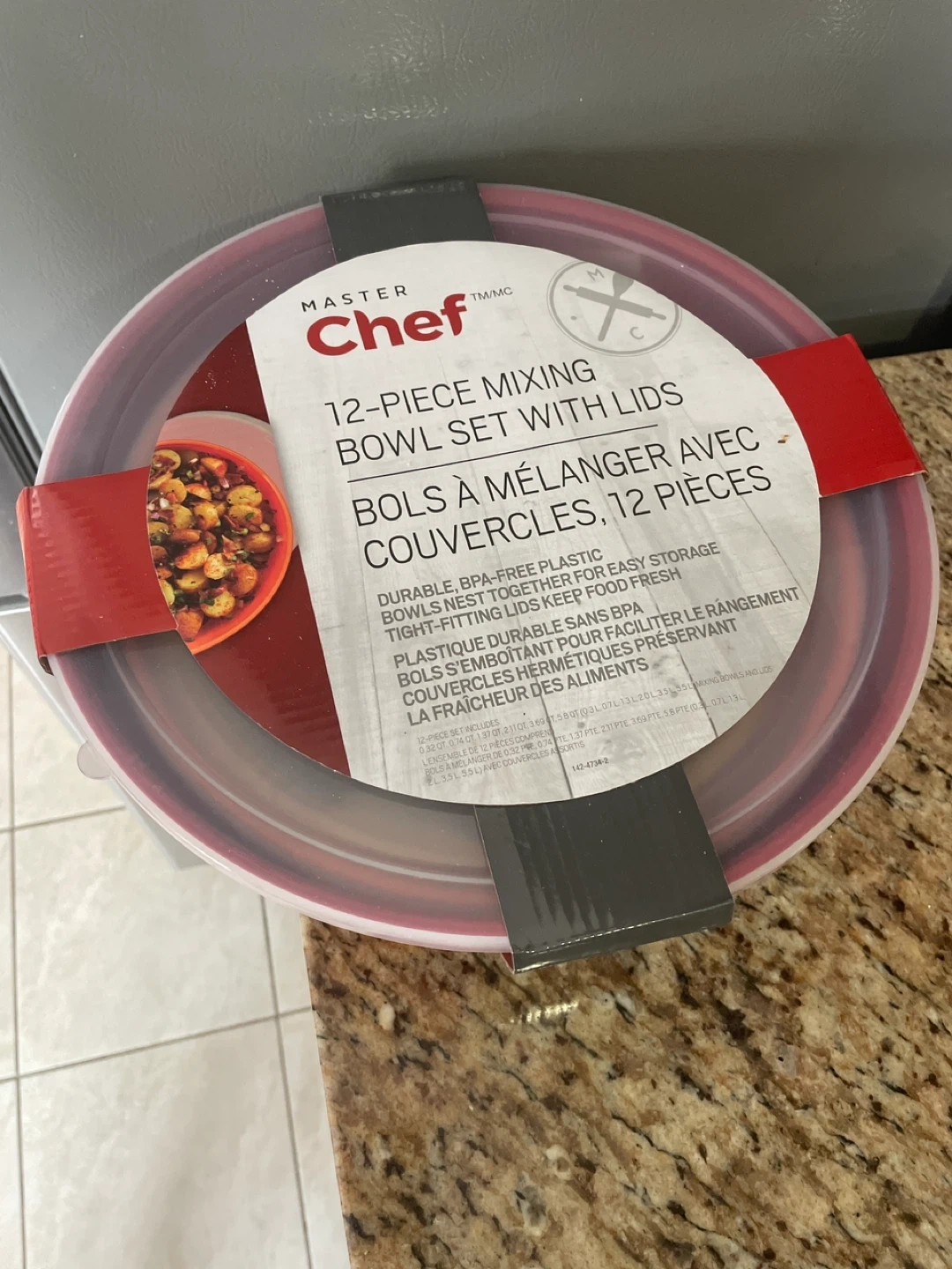 Master Chef 12-piece mixing bowl set with lids. Durable, BPA-free plastic bowls nest together. Tight-fitting lids keep food fresh. Includes bowls in sizes 0.32 Qt to 5.5 L.
