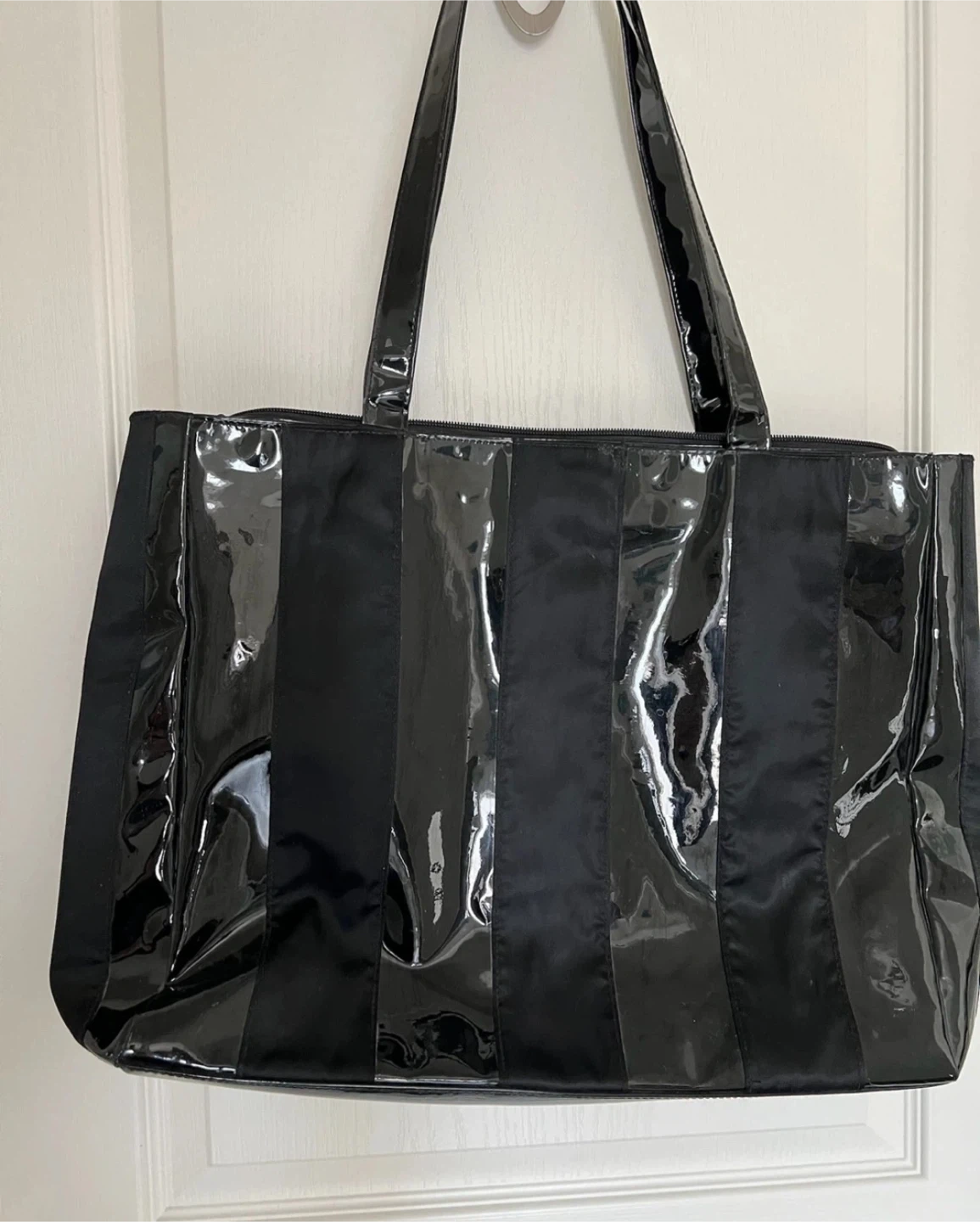 This black tote bag features a sleek design with alternating patent and matte fabric panels. It's spacious and perfect for everyday use or travel. The interior is fully lined with a zippered top closure for security.