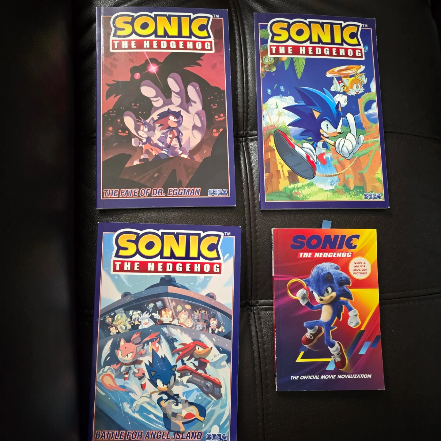 Collection of four Sonic the Hedgehog books, including 'The Fate of Dr. Eggman,' 'Battle for Angel Island,' and 'The Official Movie Novelization.' One book is noted as a major motion picture tie-in.