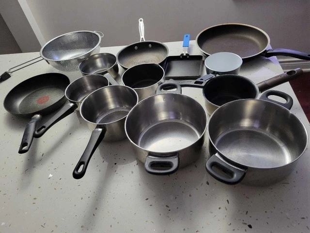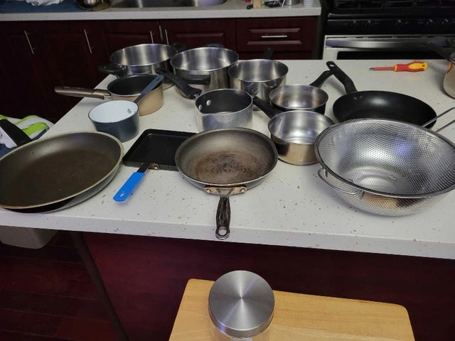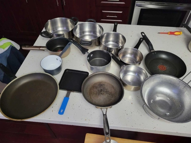 I'm offering a variety of pots and pans, each available for $5. These are used items with varying degrees of wear, perfect for someone looking for affordable cookware options. Ideal for students, new homeowners, or anyone needing to expand their kitchen supplies on a budget. If the ad is up, they're still available, ready to find a new home and sizzle up some culinary adventures. Cash accepted.