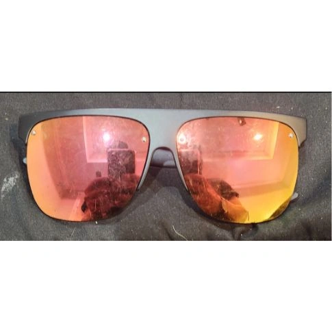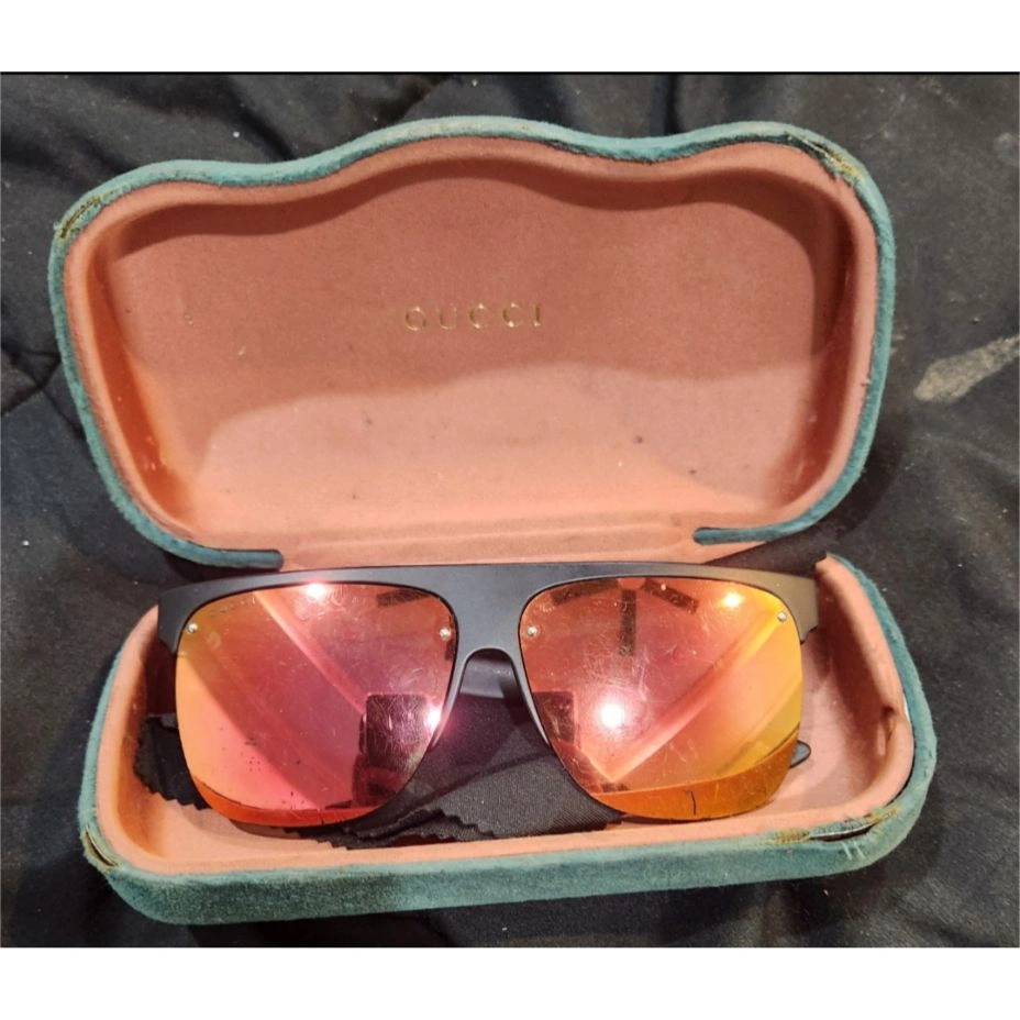 Stylish Gucci Men's or Women's Mirrored Authentic Gucci Sunglasses with black frames & official Gucci symbols. Red and orange mirrored lenses. Comes in original Green Gucci branded case. These glasses also have the "Made in Italy" stamp, the Official "Gucci" Stamp, along with the Serial number on the inside of the right arm of the Sun glasses.