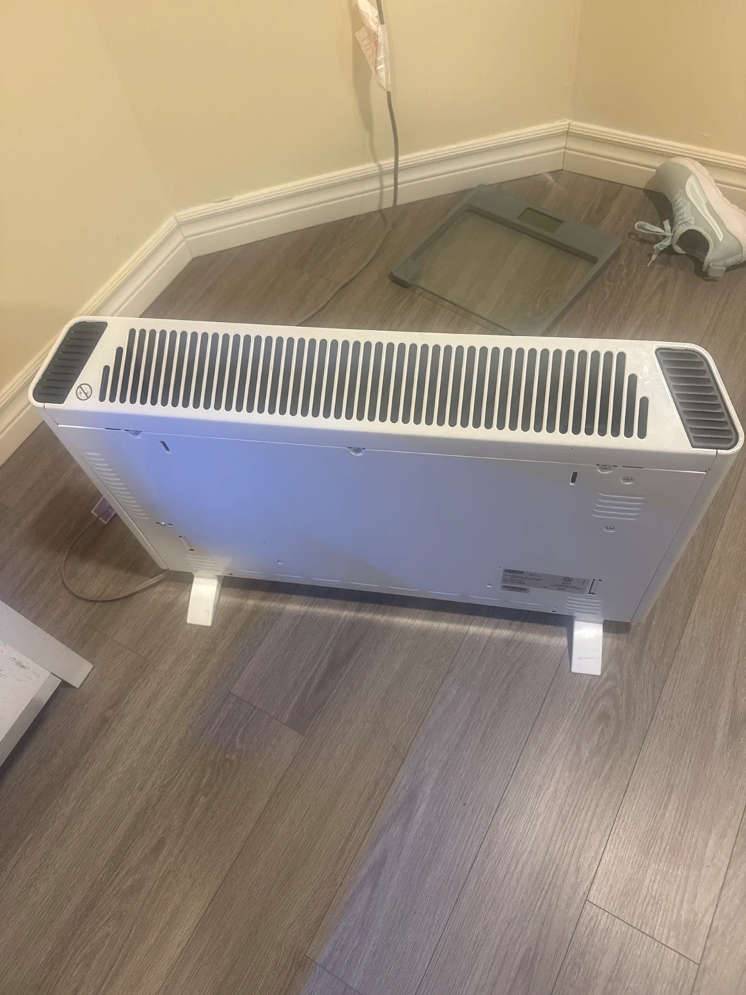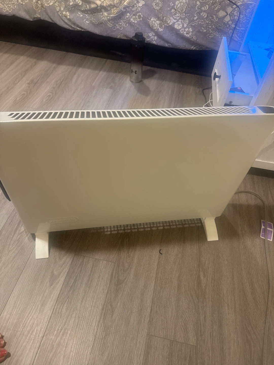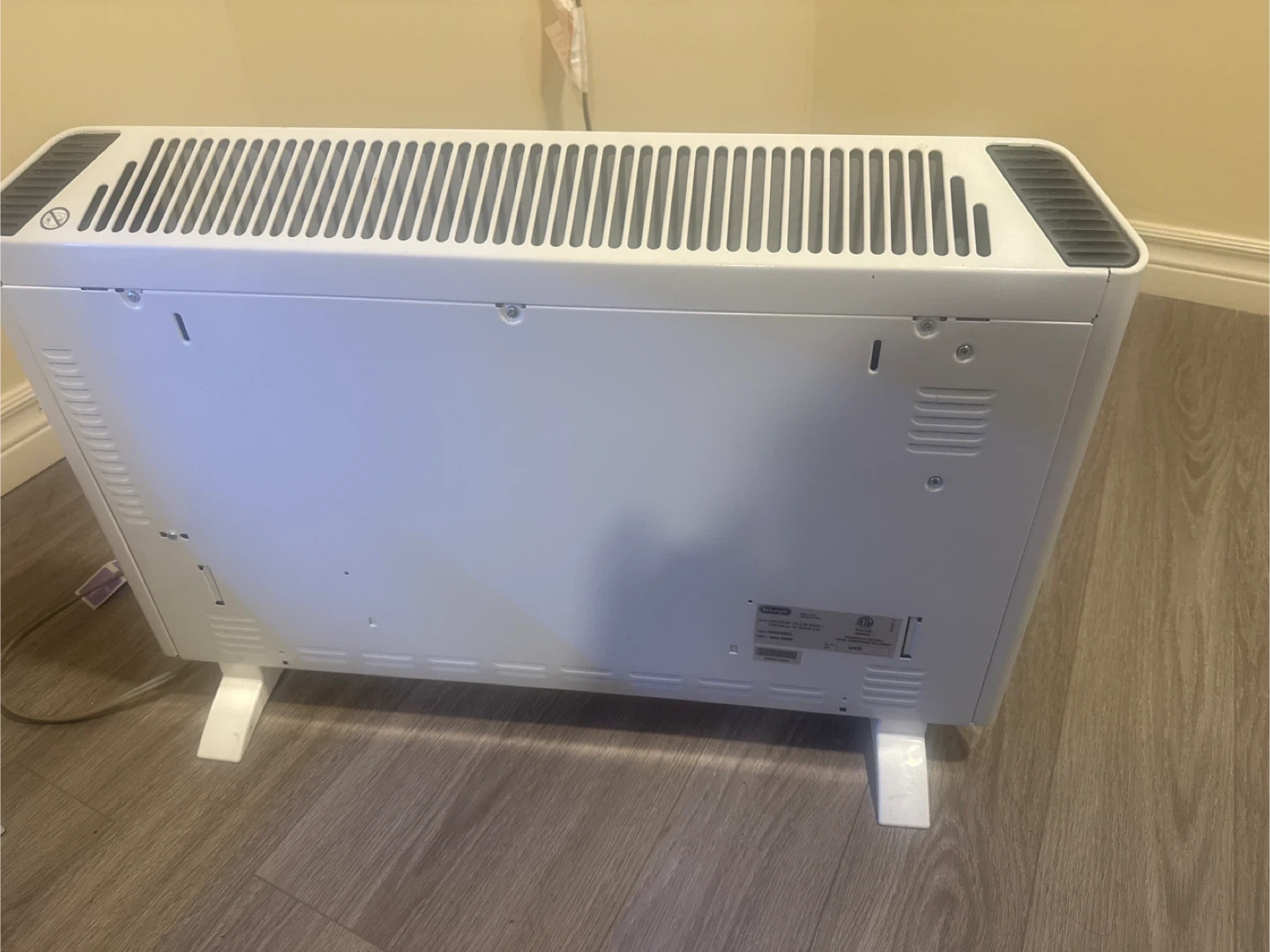 This is a white De'Longhi panel heater. It's a great way to add some extra warmth to a room. It includes two legs for stability.