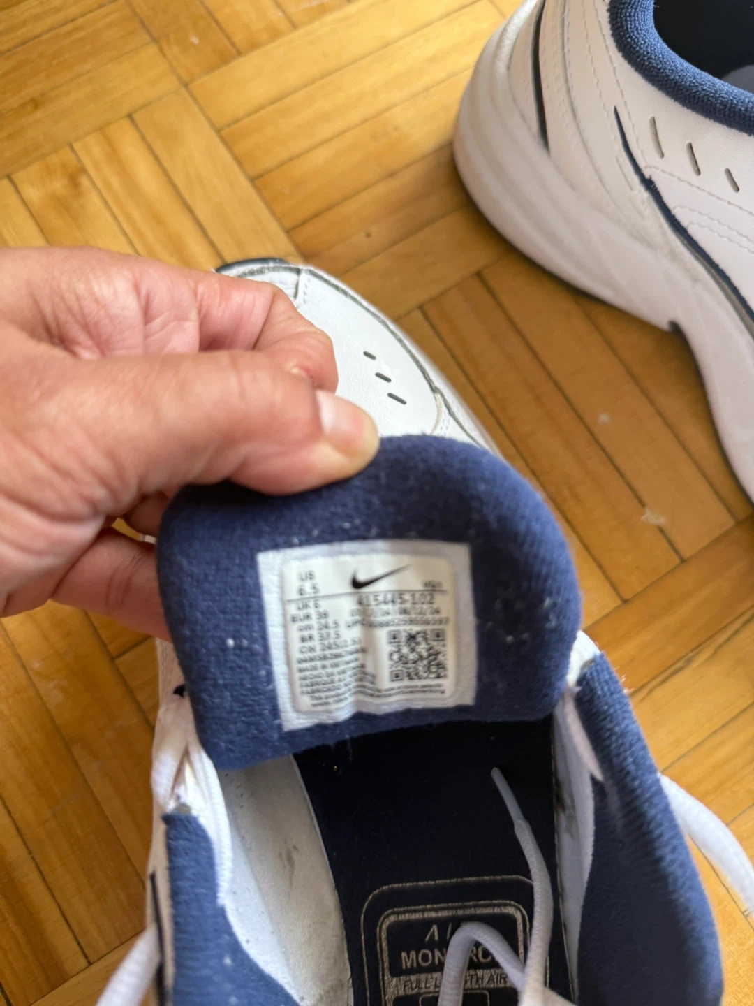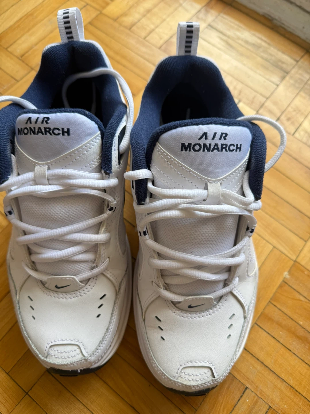 Selling a pair of Nike Air Monarch IV sneakers in white and navy. They're in great condition and are a size 6.5 US. Perfect for everyday wear or light workouts!
