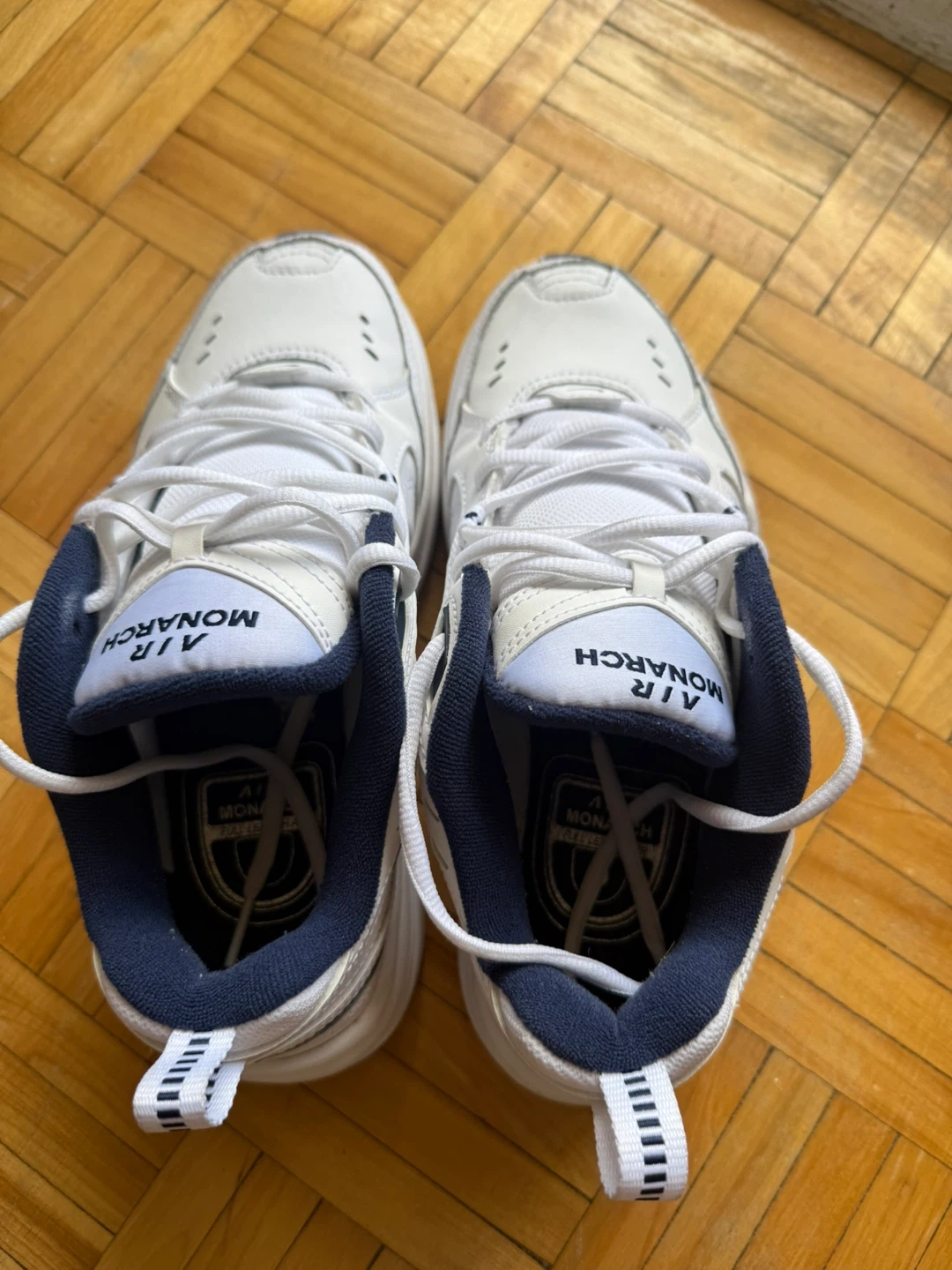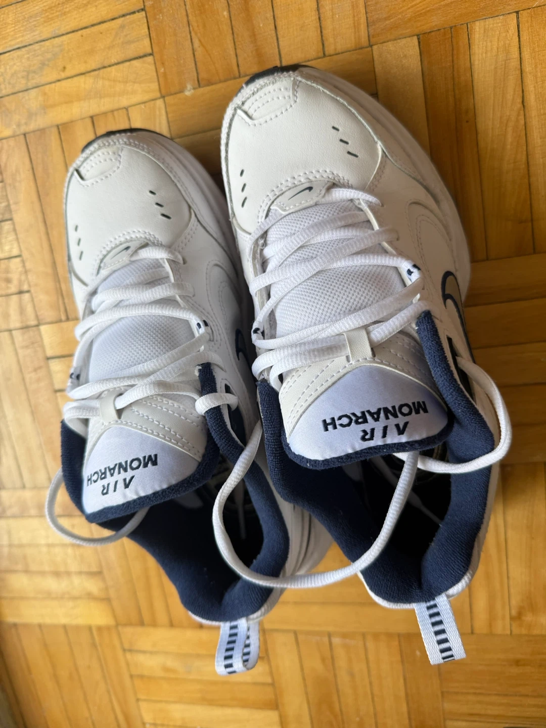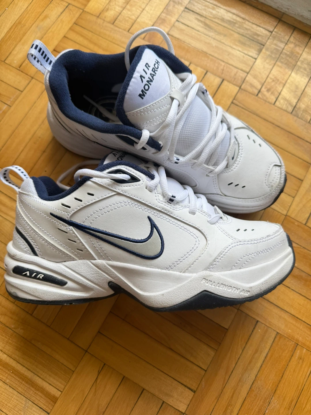 Selling a pair of Nike Air Monarch IV sneakers in white and navy. They're in great condition and are a size 6.5 US. Perfect for everyday wear or light workouts!