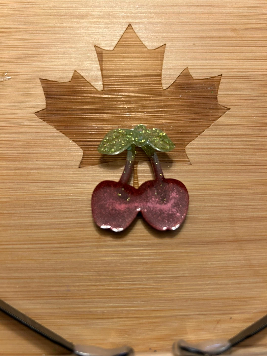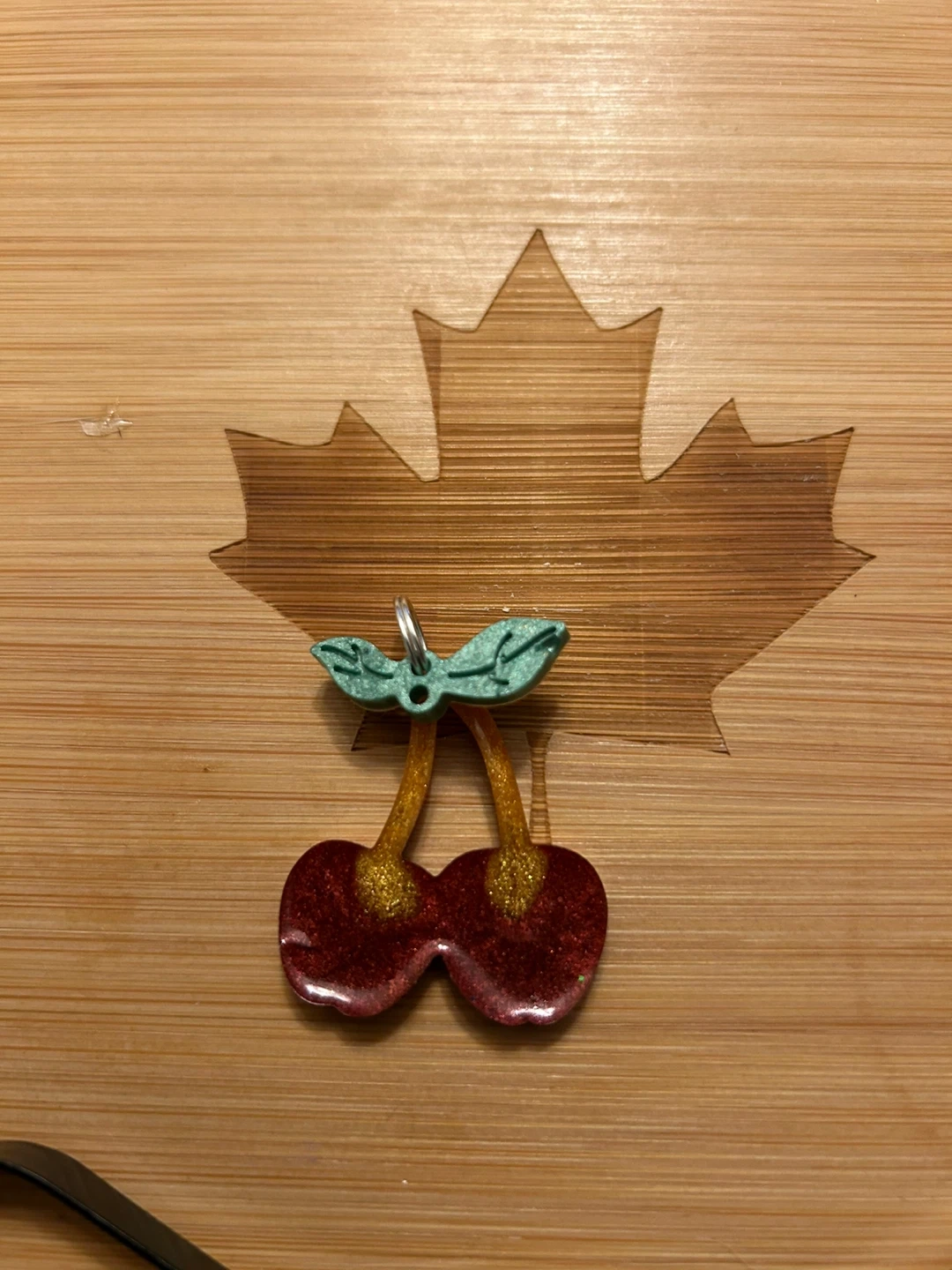Here's a cute cherry charm! It has a sparkly red colour with glittery green leaves. Perfect for adding a bit of fun to your keys or backpack. Your pet name and phone number can be customized