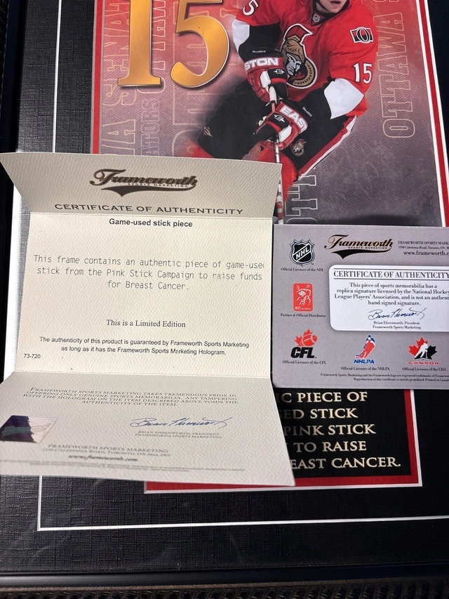 This framed memorabilia features Dany Heatley, #15, of the Ottawa Senators, including a piece of game-used stick from the Pink Stick Campaign to raise funds for breast cancer. It also includes a certificate of authenticity. This item is in great condition and would be the perfect addition to any hockey fan's collection. Player: Dany Heatley, Team: Ottawa Senators, Piece of game-used stick included, Pink Stick Campaign for Breast Cancer Awareness, Framed and ready to hang, Certificate of Authenticity. Condition: Used - Like new. Payment: Cashless payment, Cash accepted.