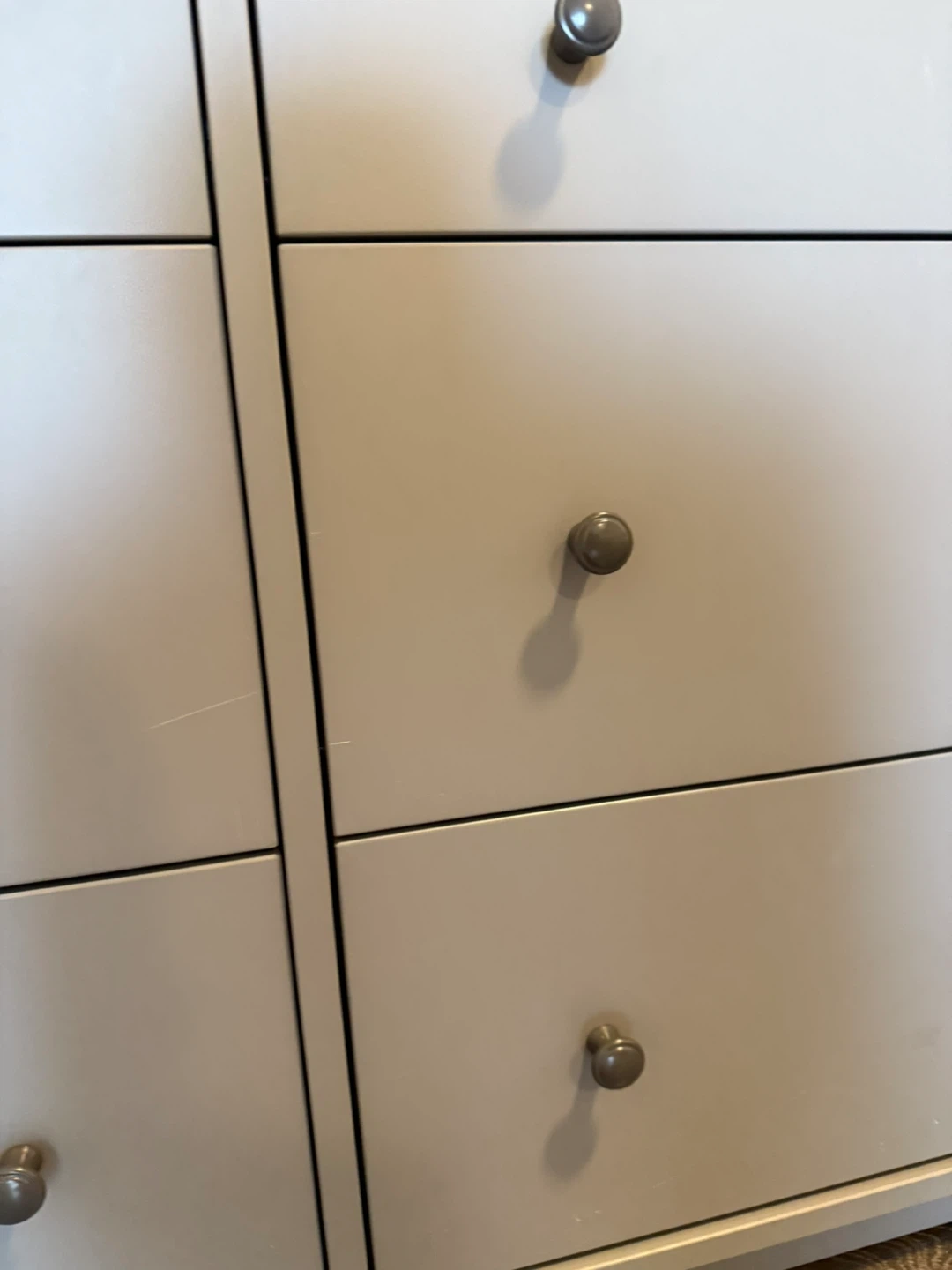 This is a gray IKEA HEMNES 6-drawer dresser. It's 138 cm wide and 84 cm tall. Some minor scuffs are visible on the drawer fronts.