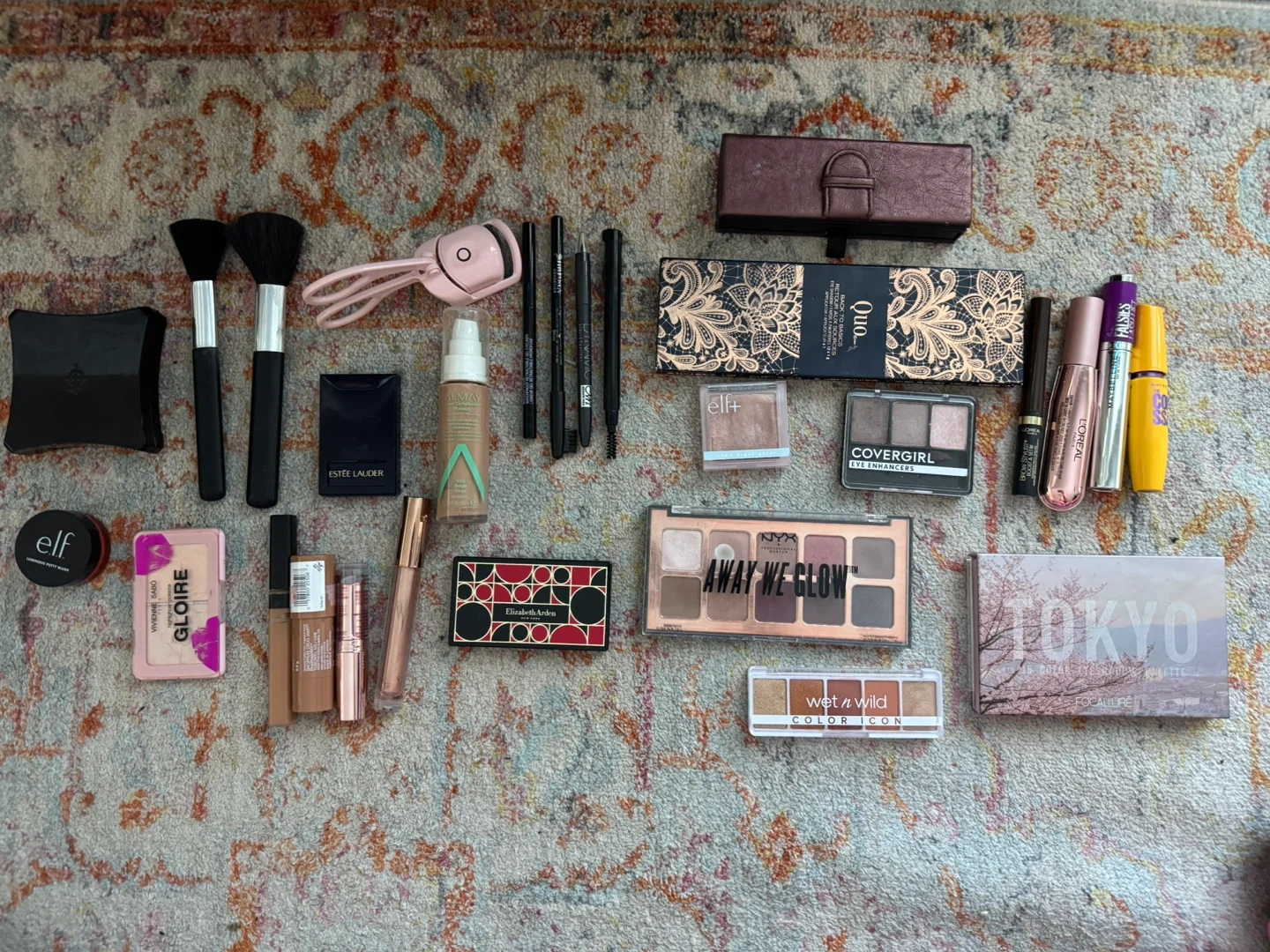 Selling a variety of makeup items! This lot includes eyeshadow palettes, makeup brushes, and other cosmetics from brands like e.l.f., Estee Lauder, Covergirl, and more. Great for experimenting with different looks or stocking up on your favourites
