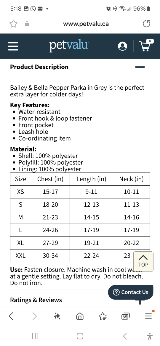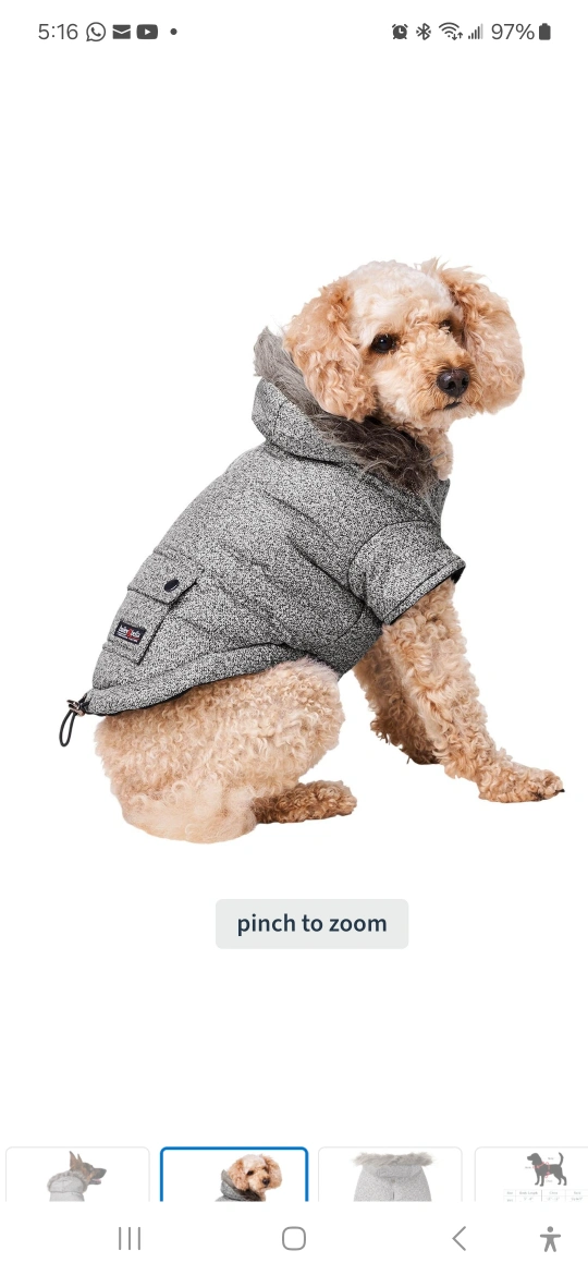 Grey dog parka. Water-resistant. Front hook & loop fastener. Front pocket. Leash hole. Co-ordinating item. Machine wash. Do not bleach. Lay flat to dry. Do not iron.