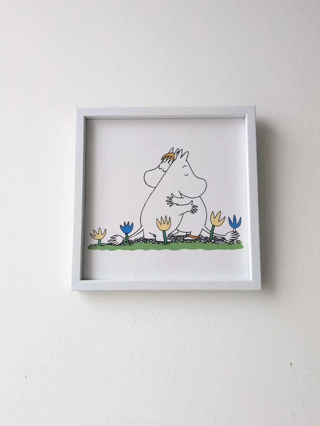 Sweet Moomin characters hugging in a garden. Features Moomintroll and Snorkmaiden art. White frame included.