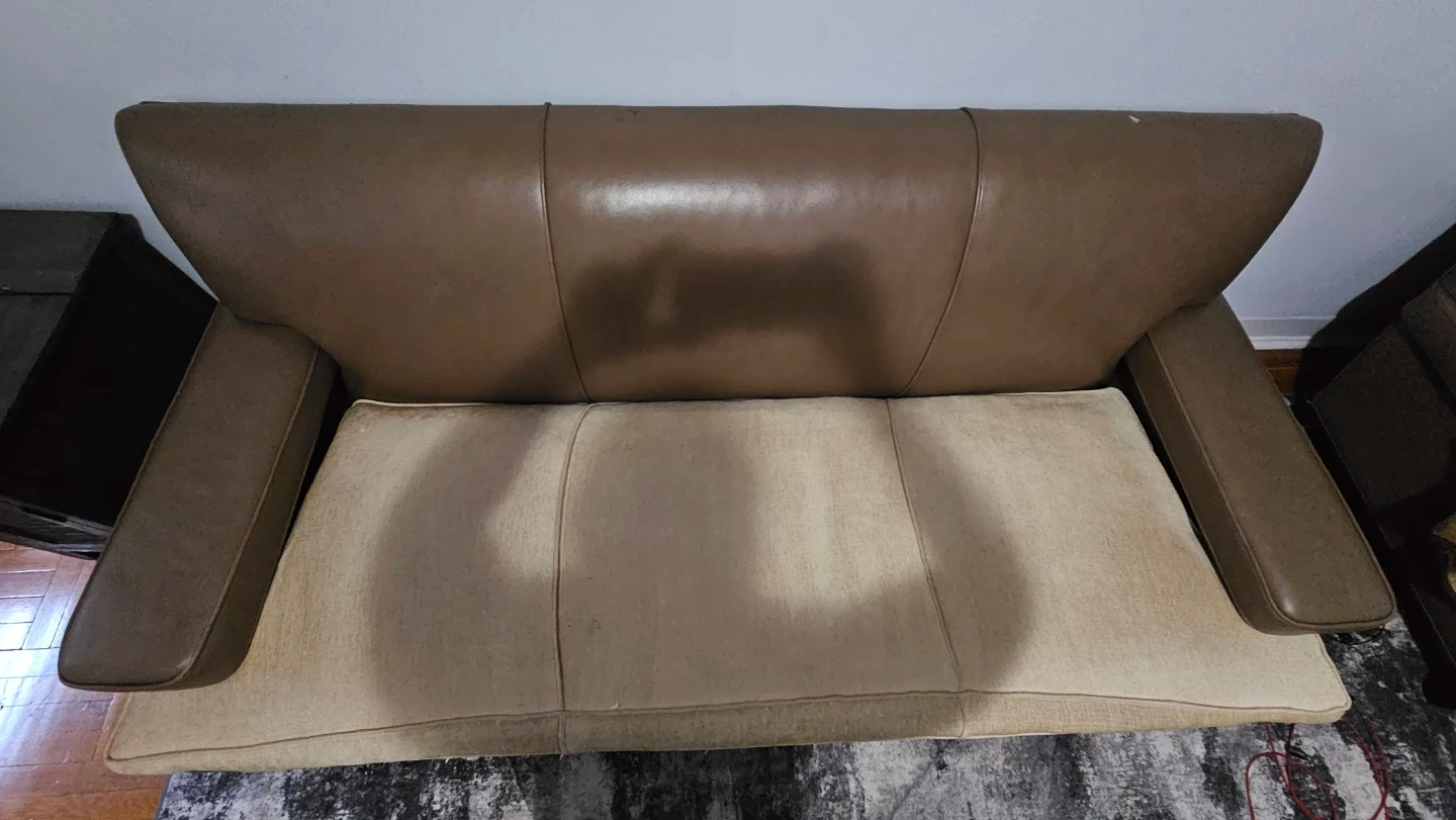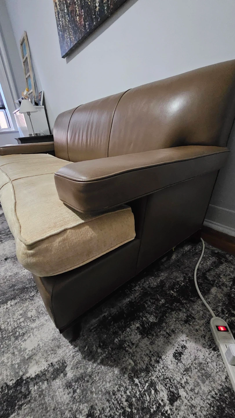 Brown Leather Sofa with Tan Fabric Cushions