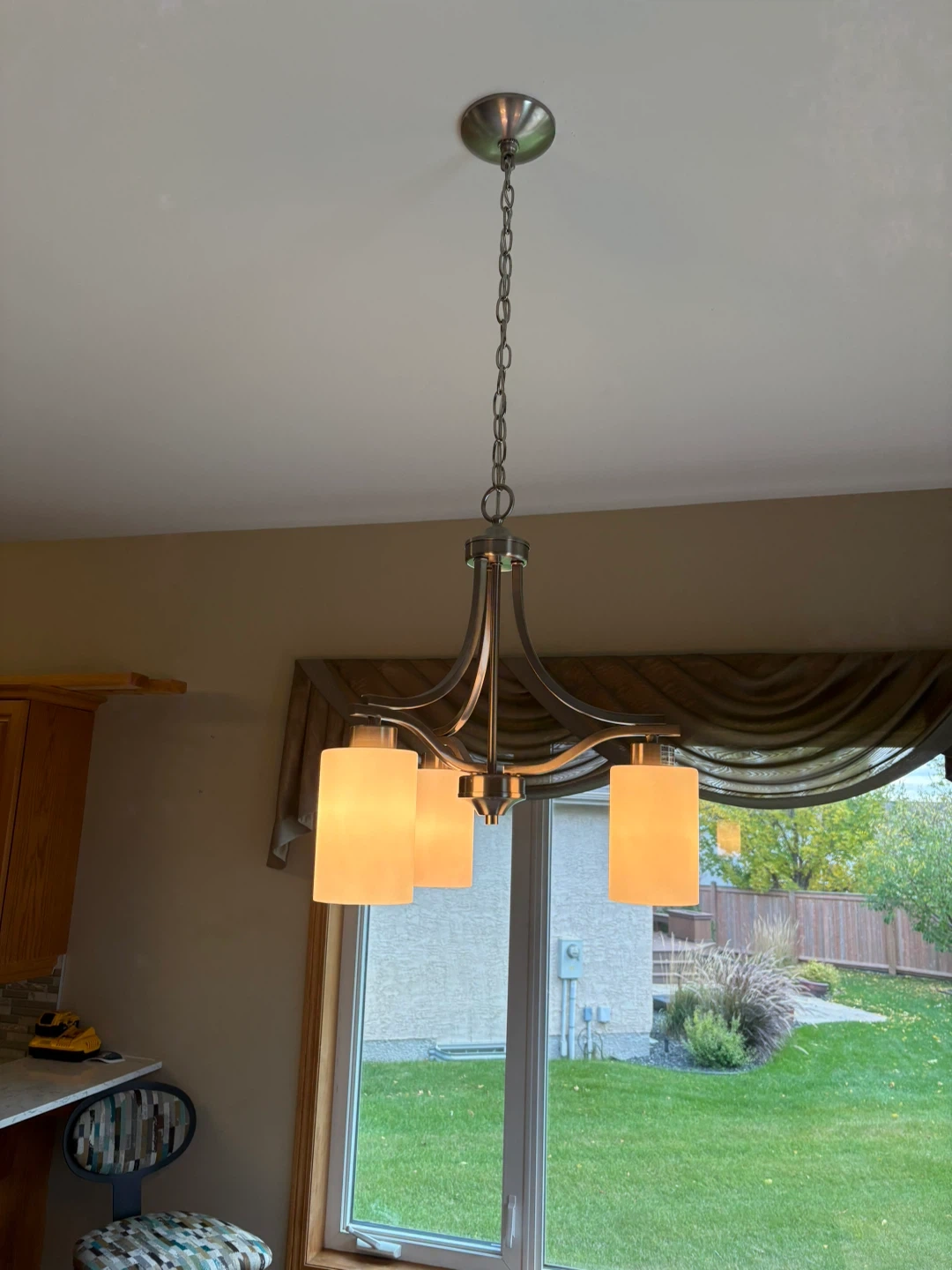 Selling a stylish three-light chandelier with a brushed nickel finish. It's in great shape and would be a lovely addition to any dining room or kitchen! The shades are a soft, warm white, providing a cozy ambiance